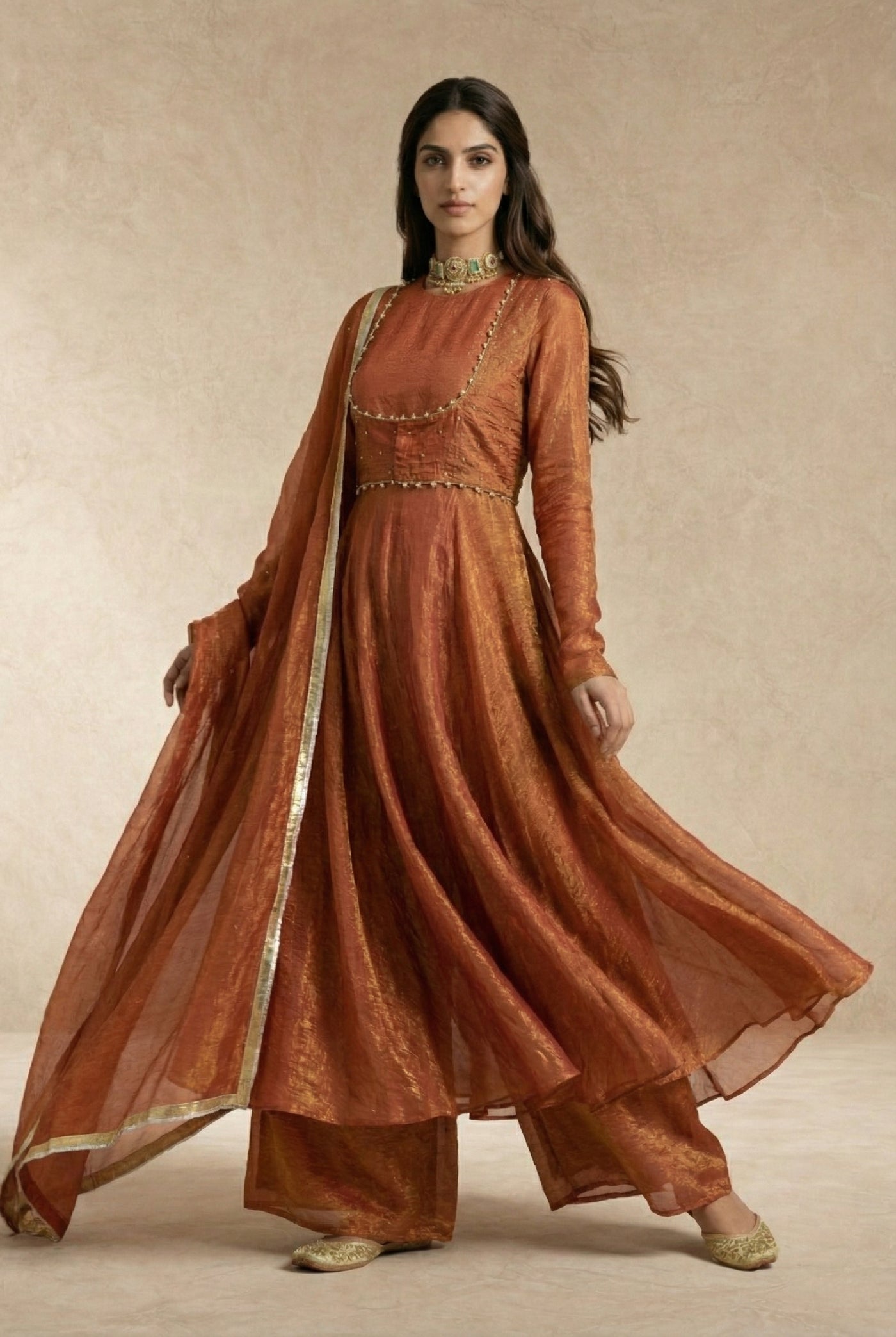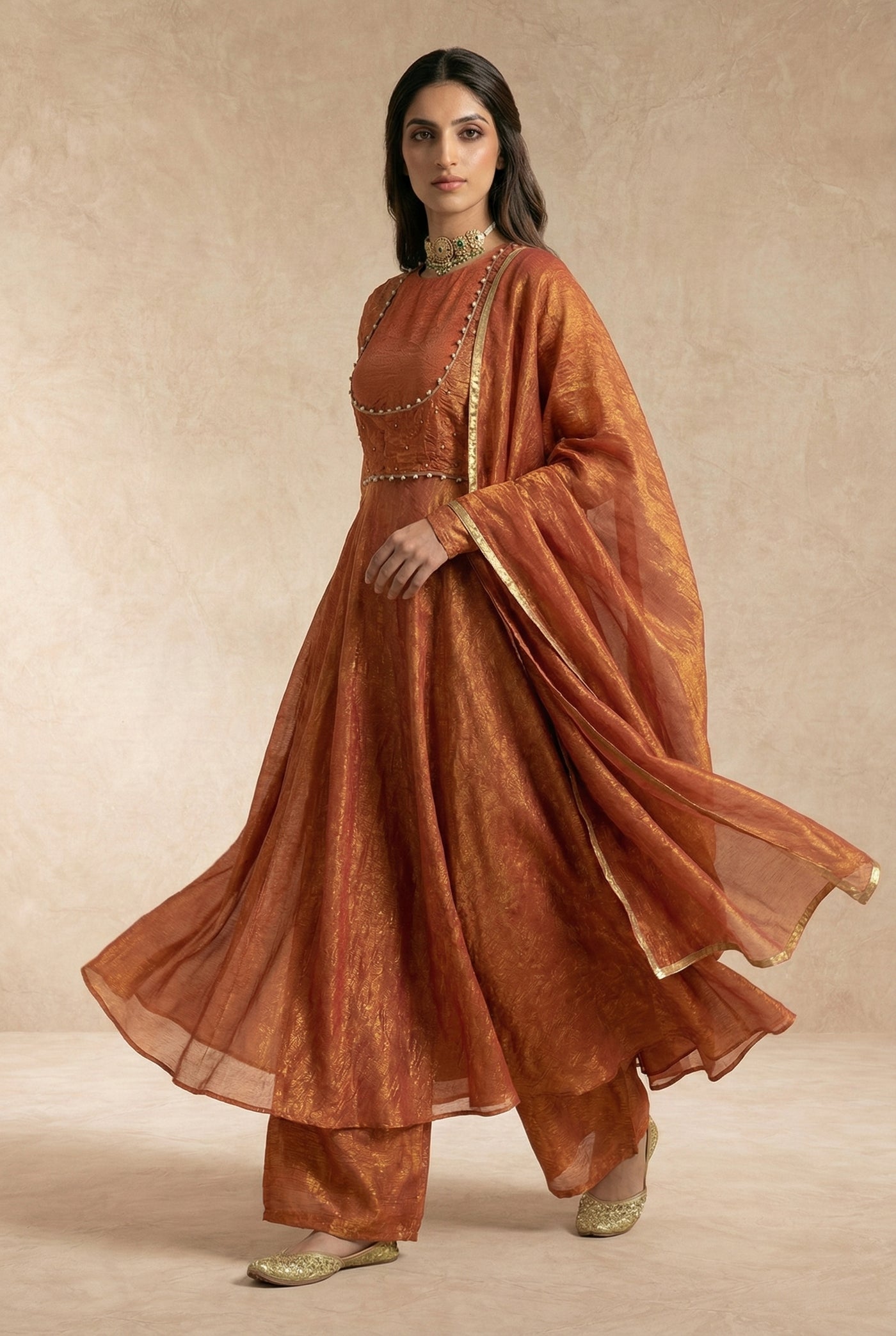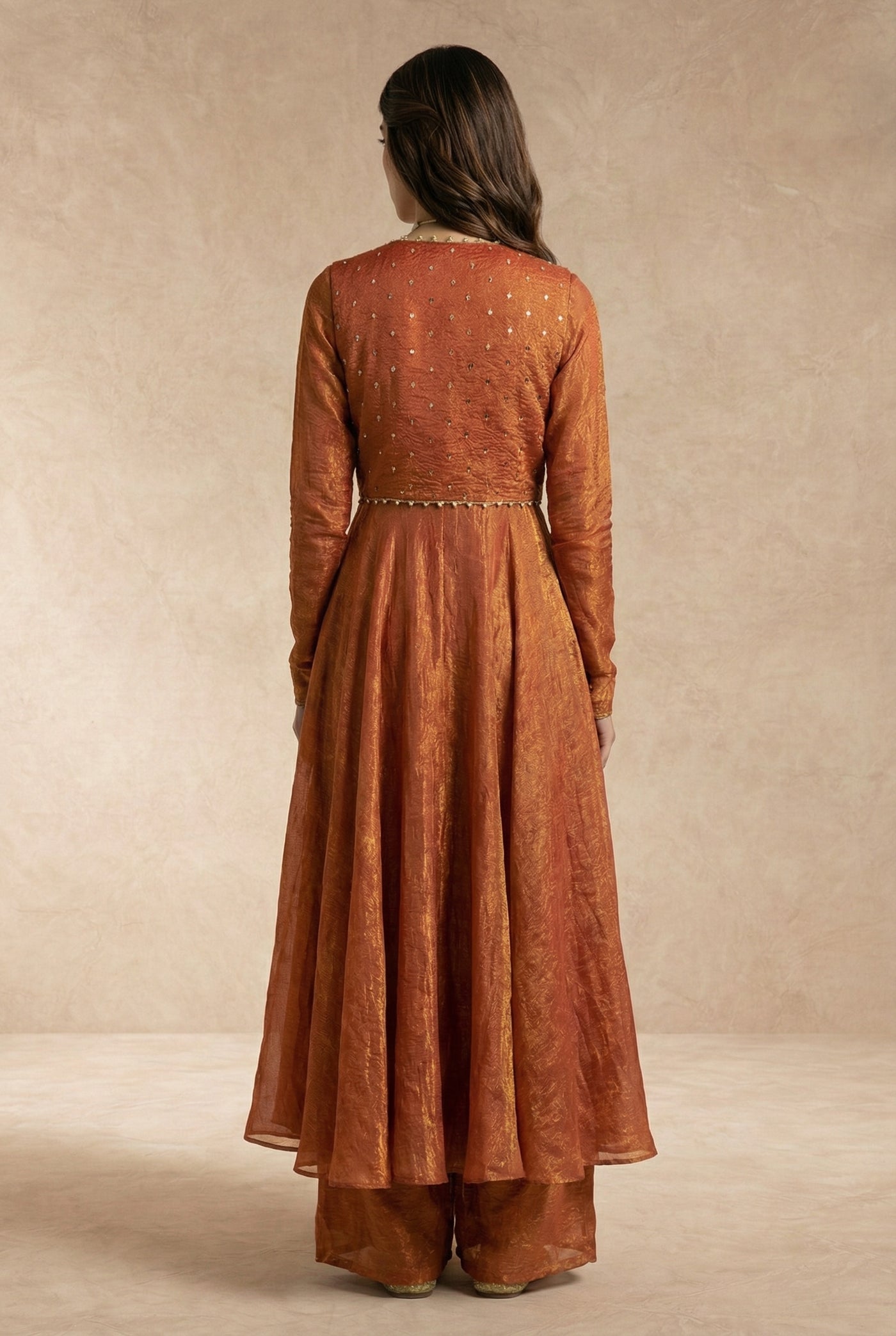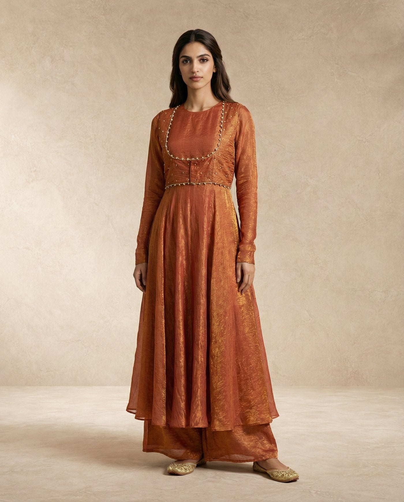 A refined rust-gold silhouette where metallic crushed silk meets modern, waist-defined tailoring.