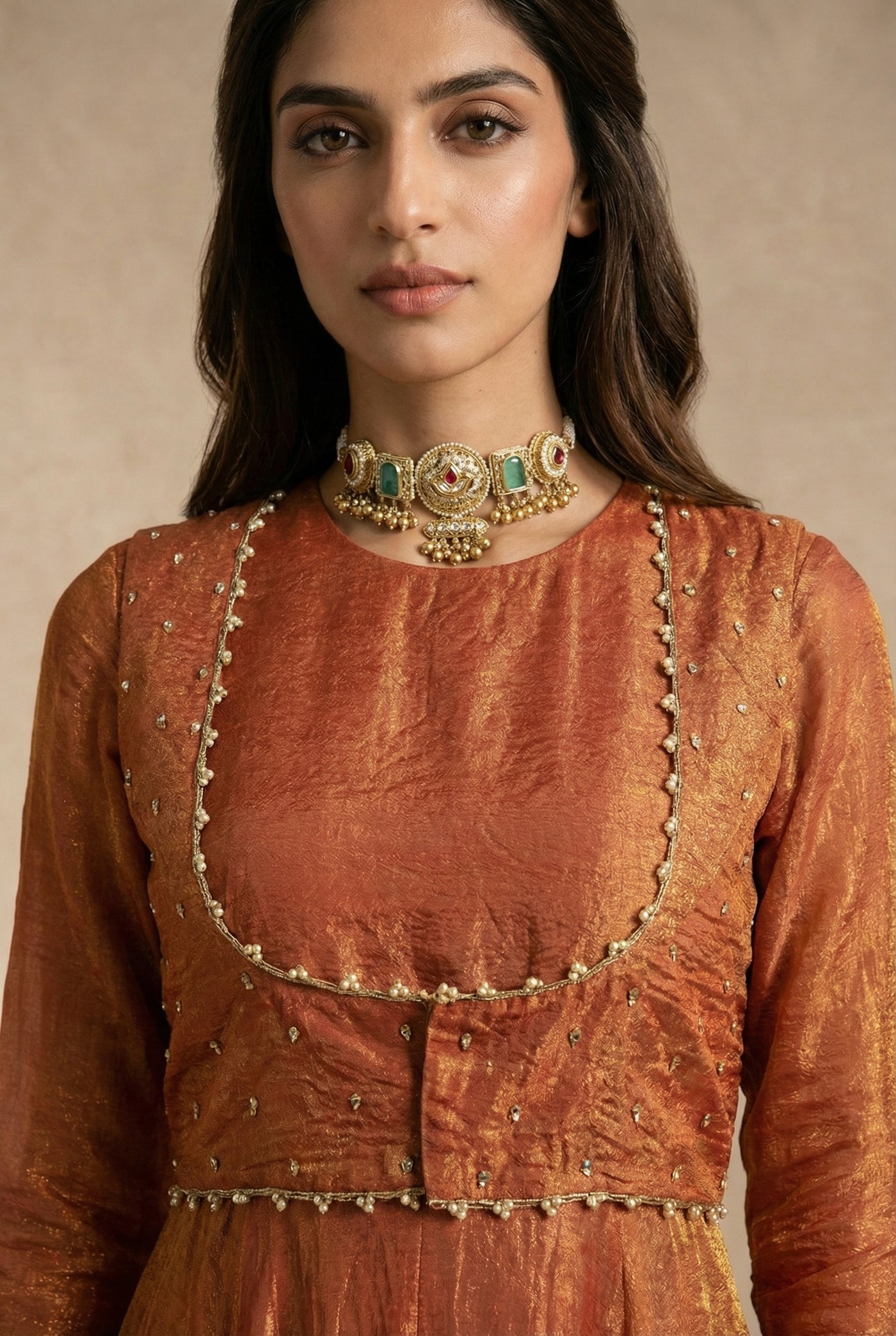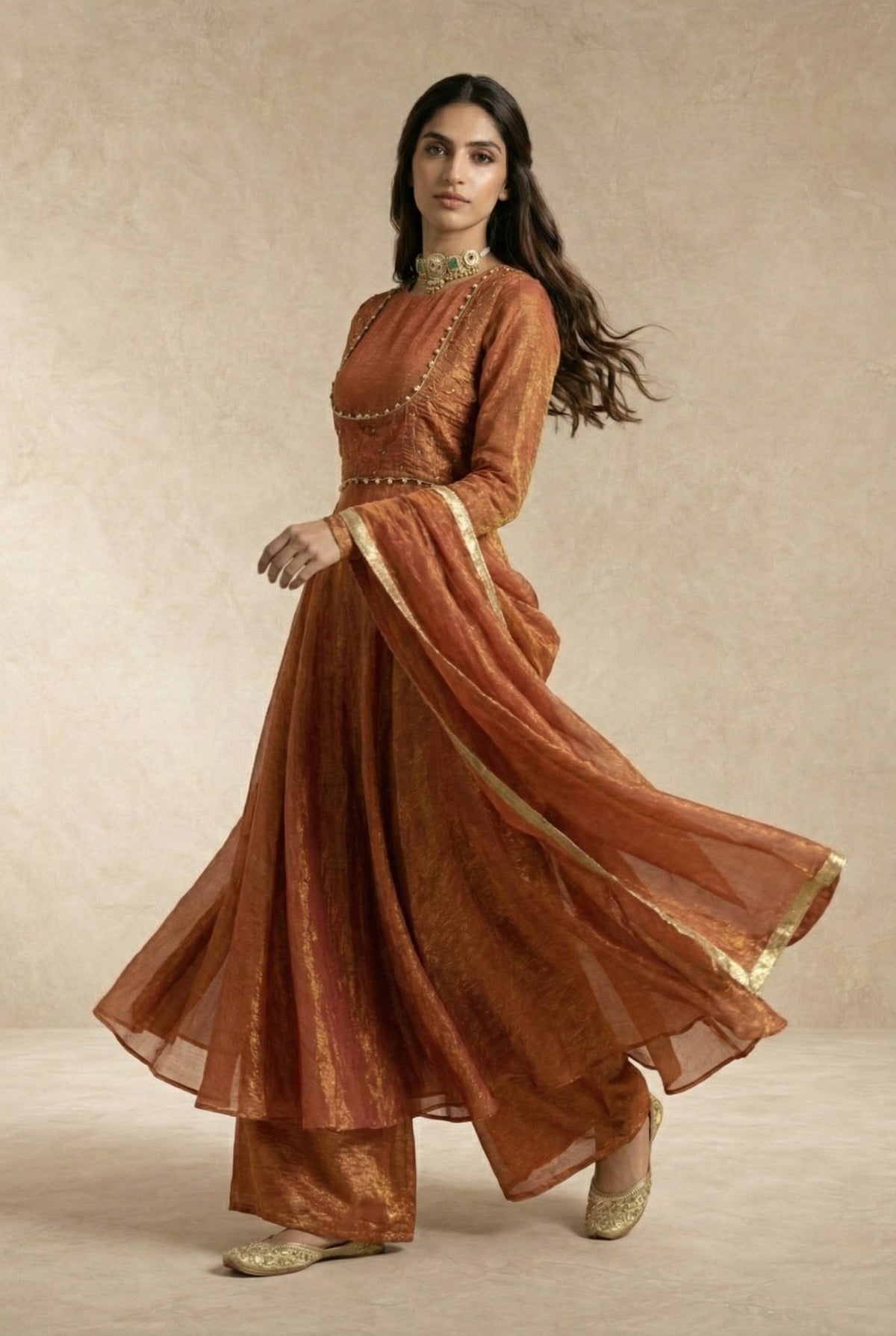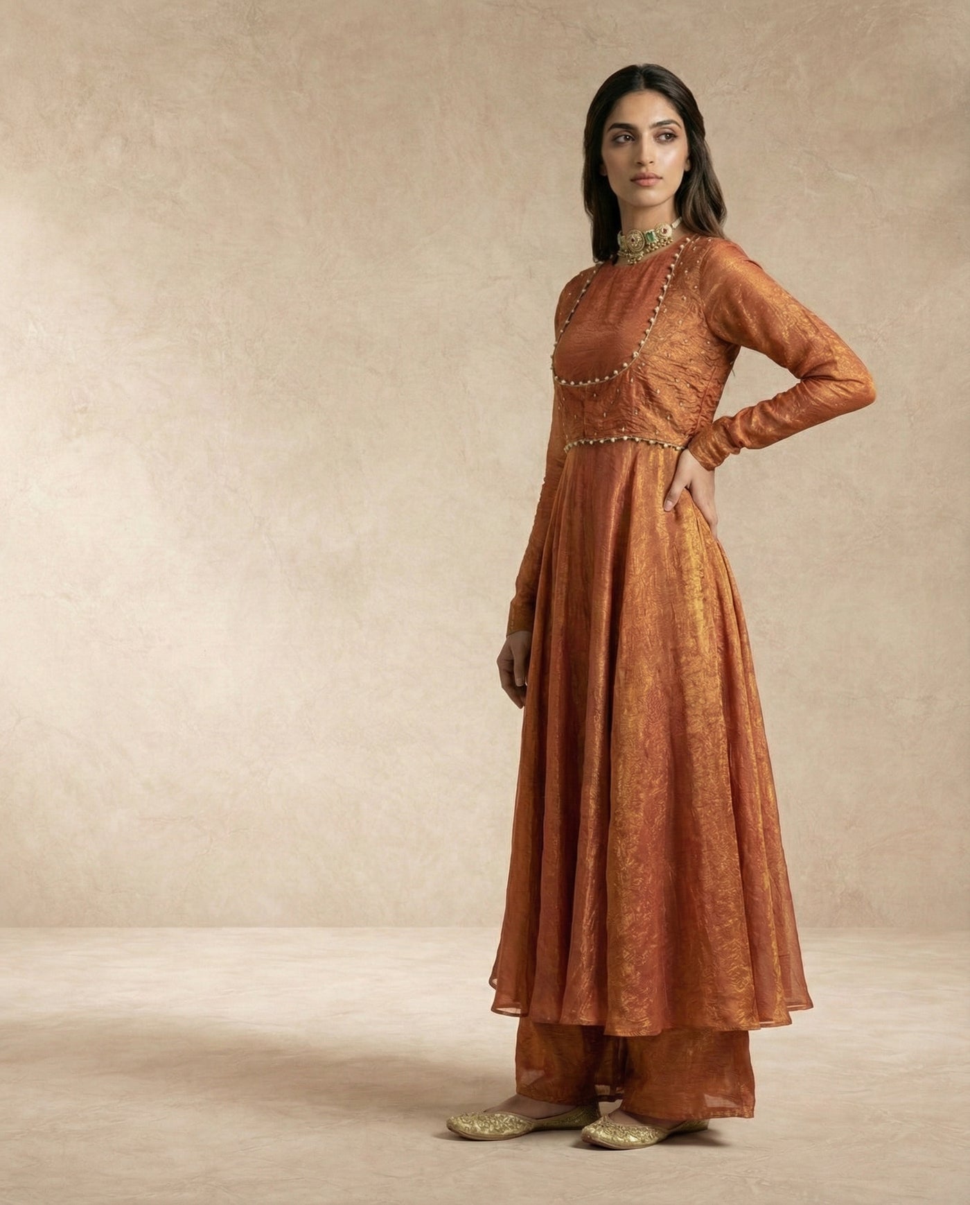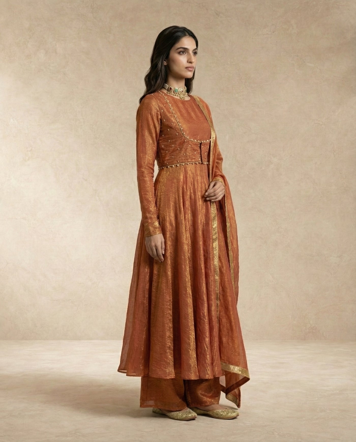 A refined rust-gold silhouette where metallic crushed silk meets modern, waist-defined tailoring.
