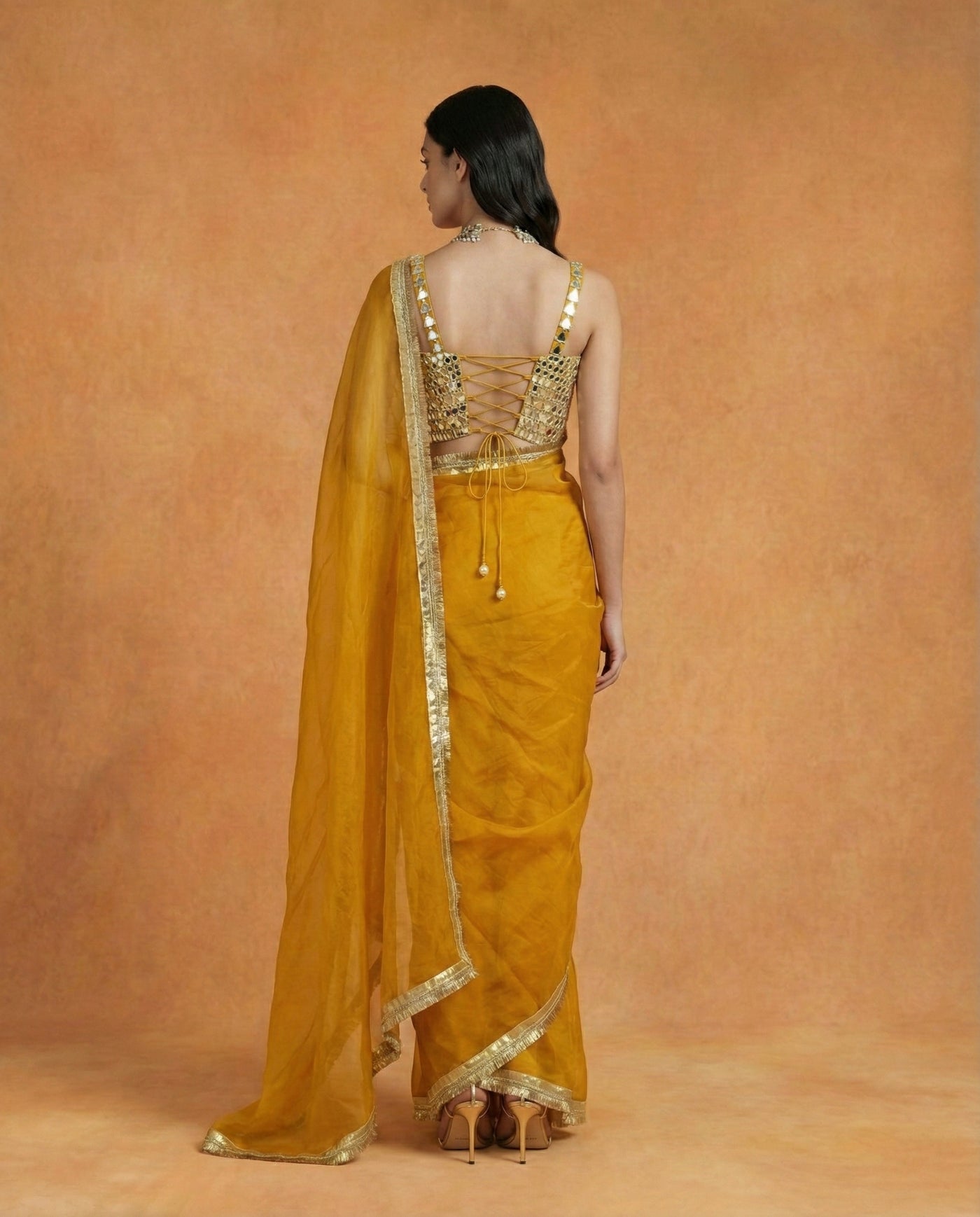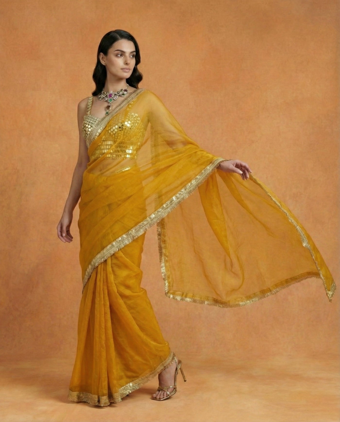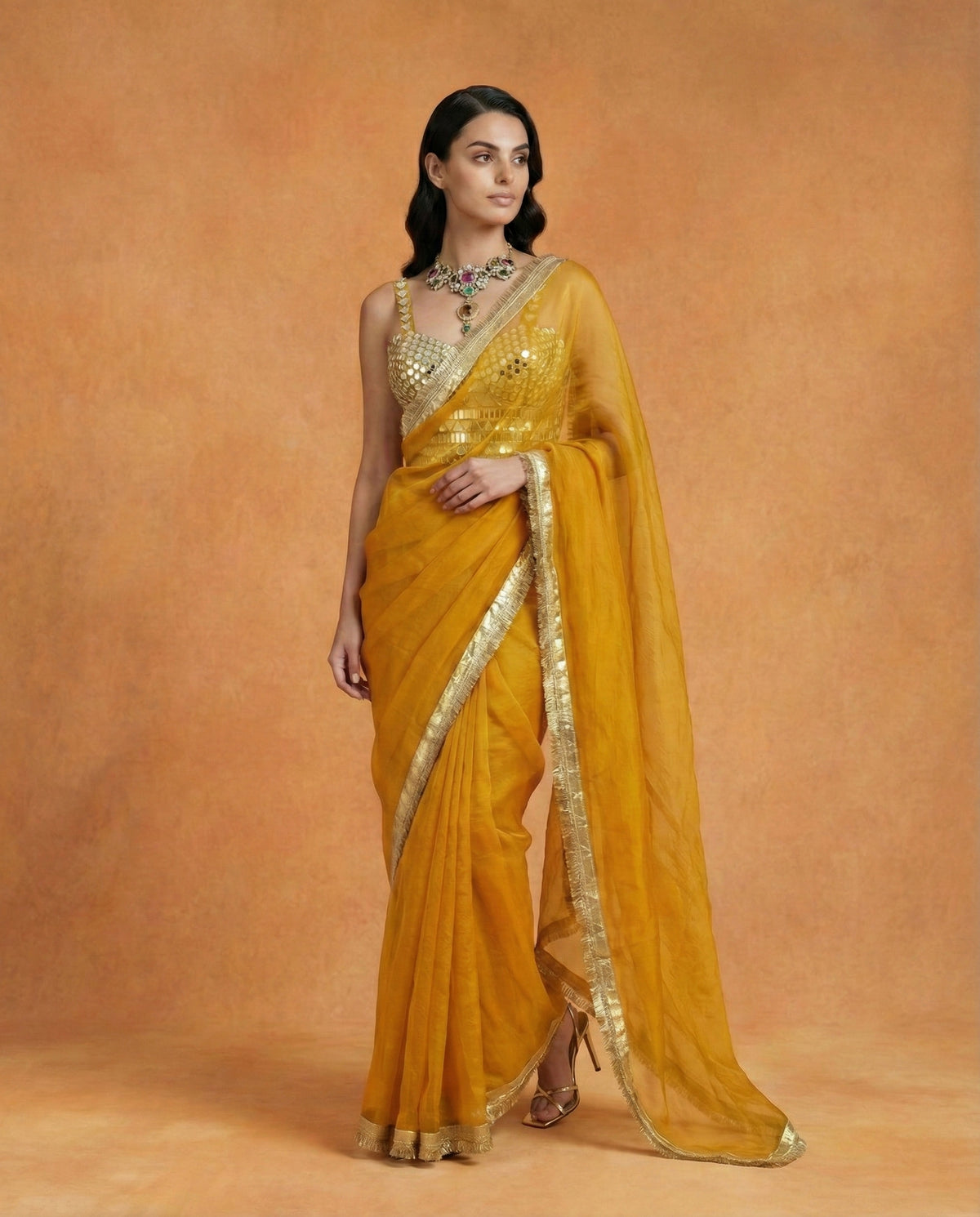 Radiate timeless glamour with the Anvika saree, a highlight of our premium collection. This ensemble features a lightweight organza saree in a vibrant mustard gold, finished with a delicate gold Gota-lace border that catches the light beautifully. It is paired with a spectacular sleeveless blouse, entirely hand-embellished with intricate gold mirror-work and geometric sequin patterns. Designed for high-octane celebrations, Anvika offers a perfect balance of traditional craft and contemporary shimmer, ideal for weddings, sangeets, or grand festive soirées.