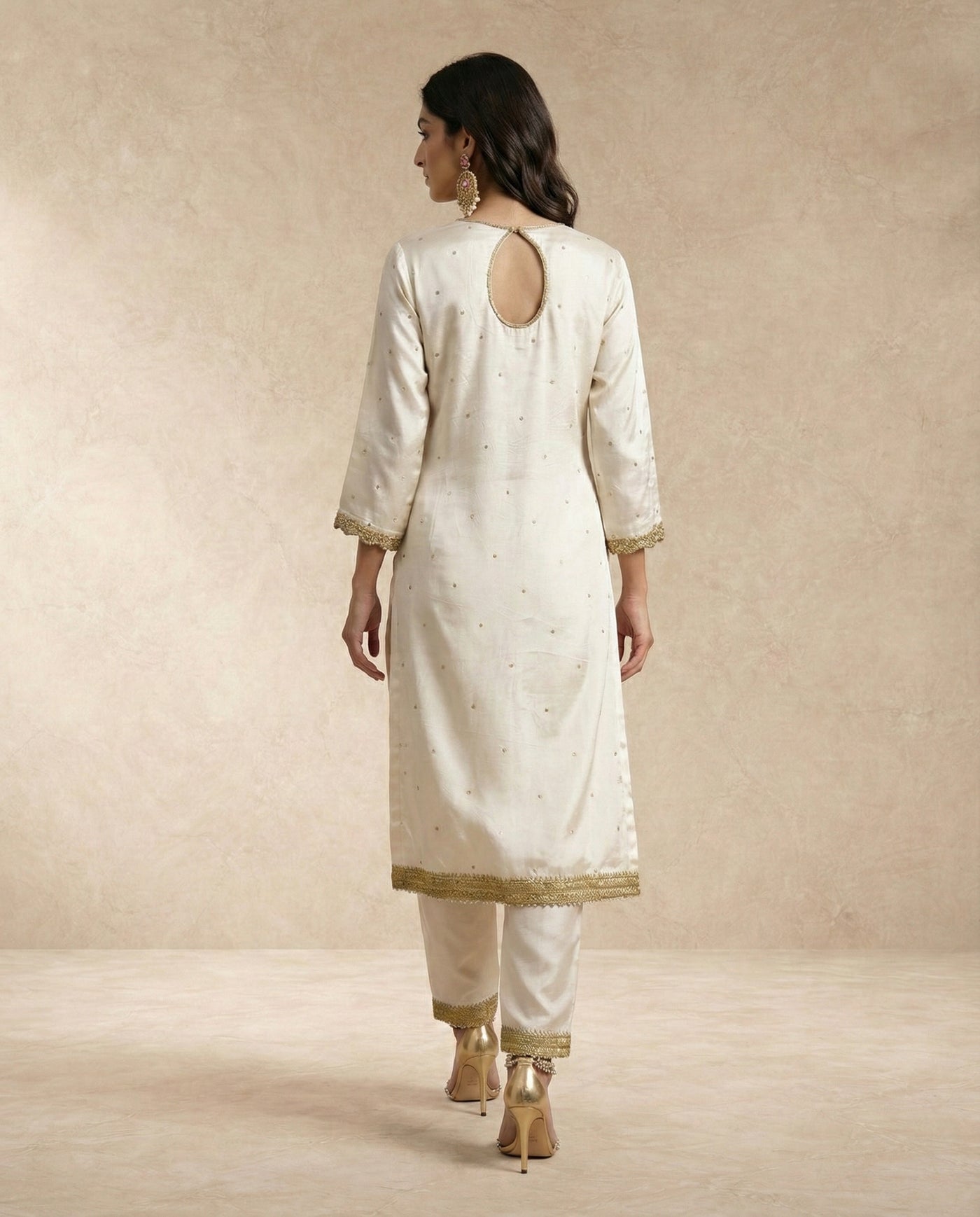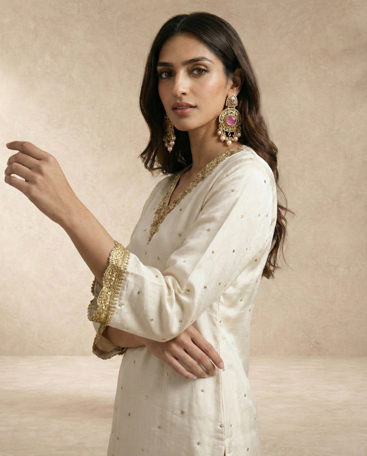 Champagne-gold silk, antique zari embroidery, and refined buti detailing define Anwari’s quiet radiance.
