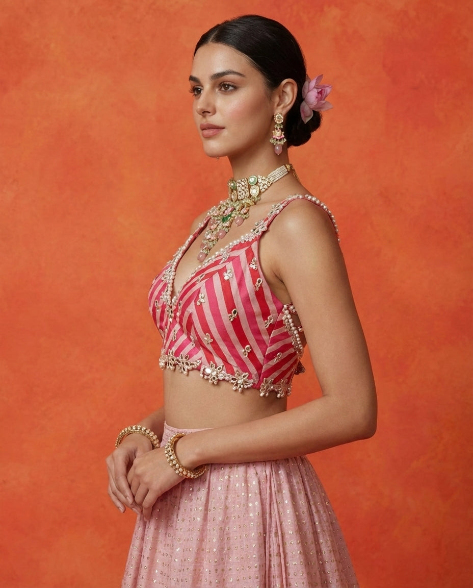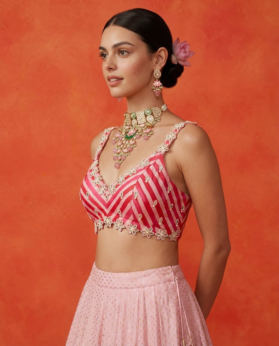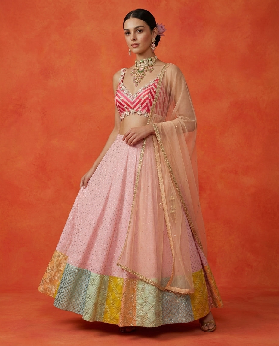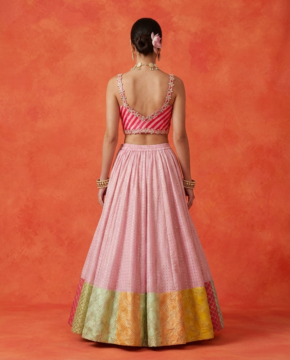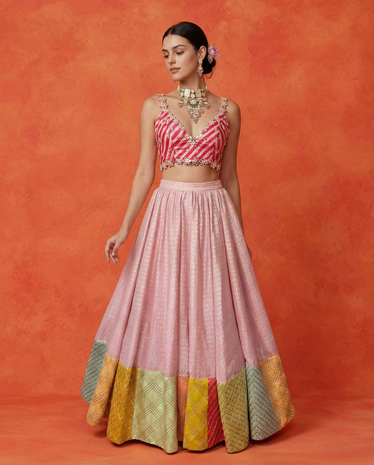 Soft blush tones meet festive lattice detailing in lime, saffron, and magenta, finished with a scalloped floral border.