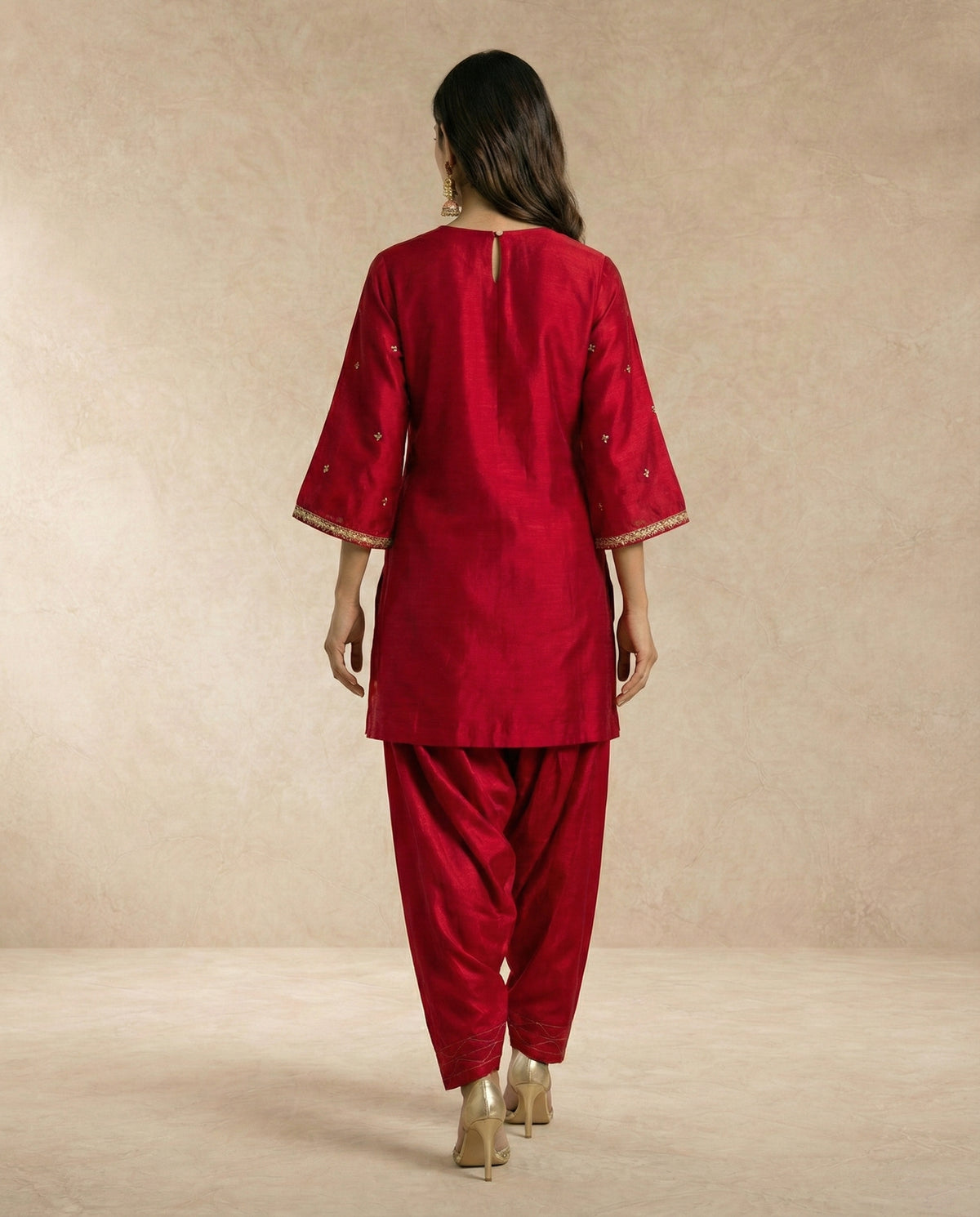 Deep red silk, antique-gold leaf motifs, and refined zari detailing define Farheen.