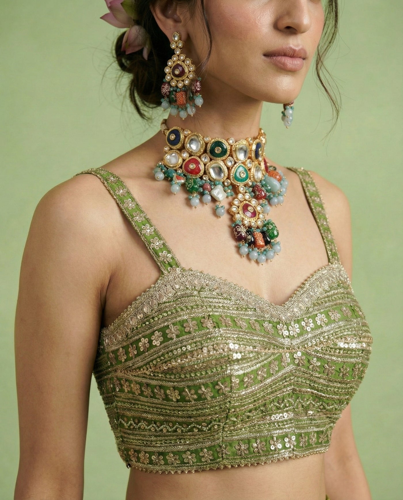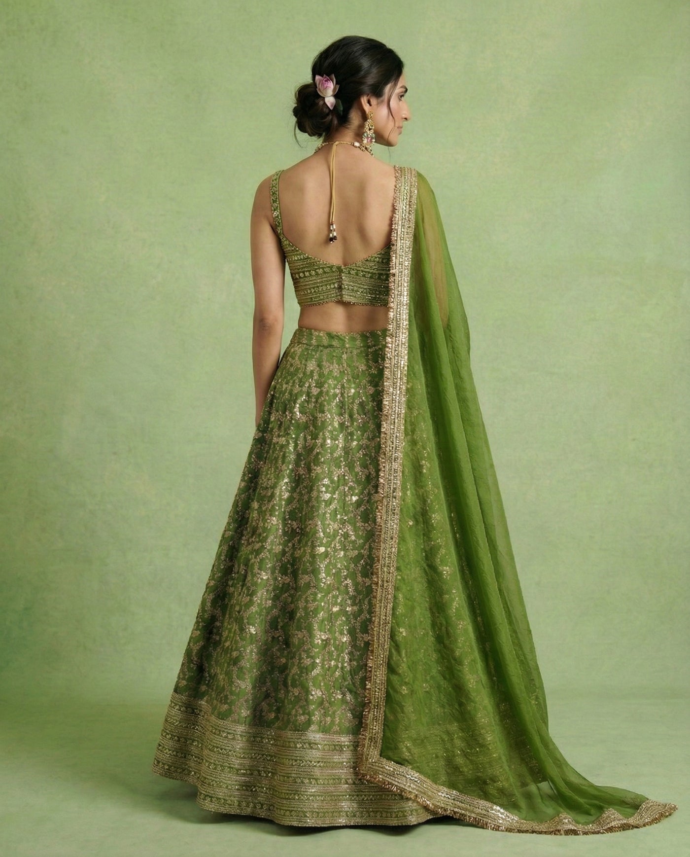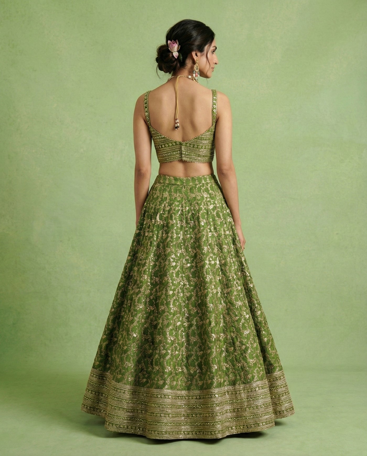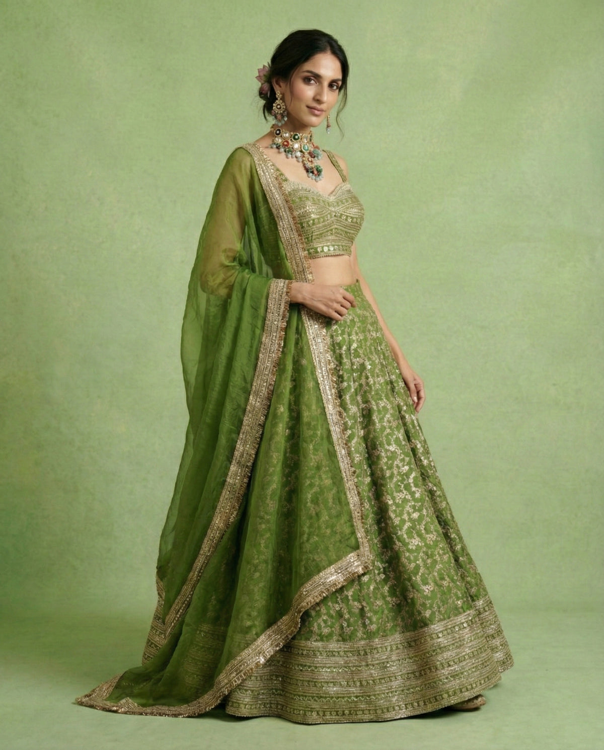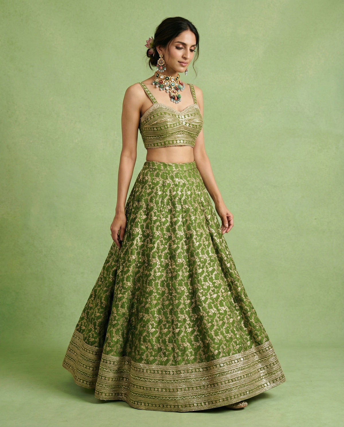 Deep forest green meets tonal Gota Patti and gold embroidery in a fluid, contemporary silhouette