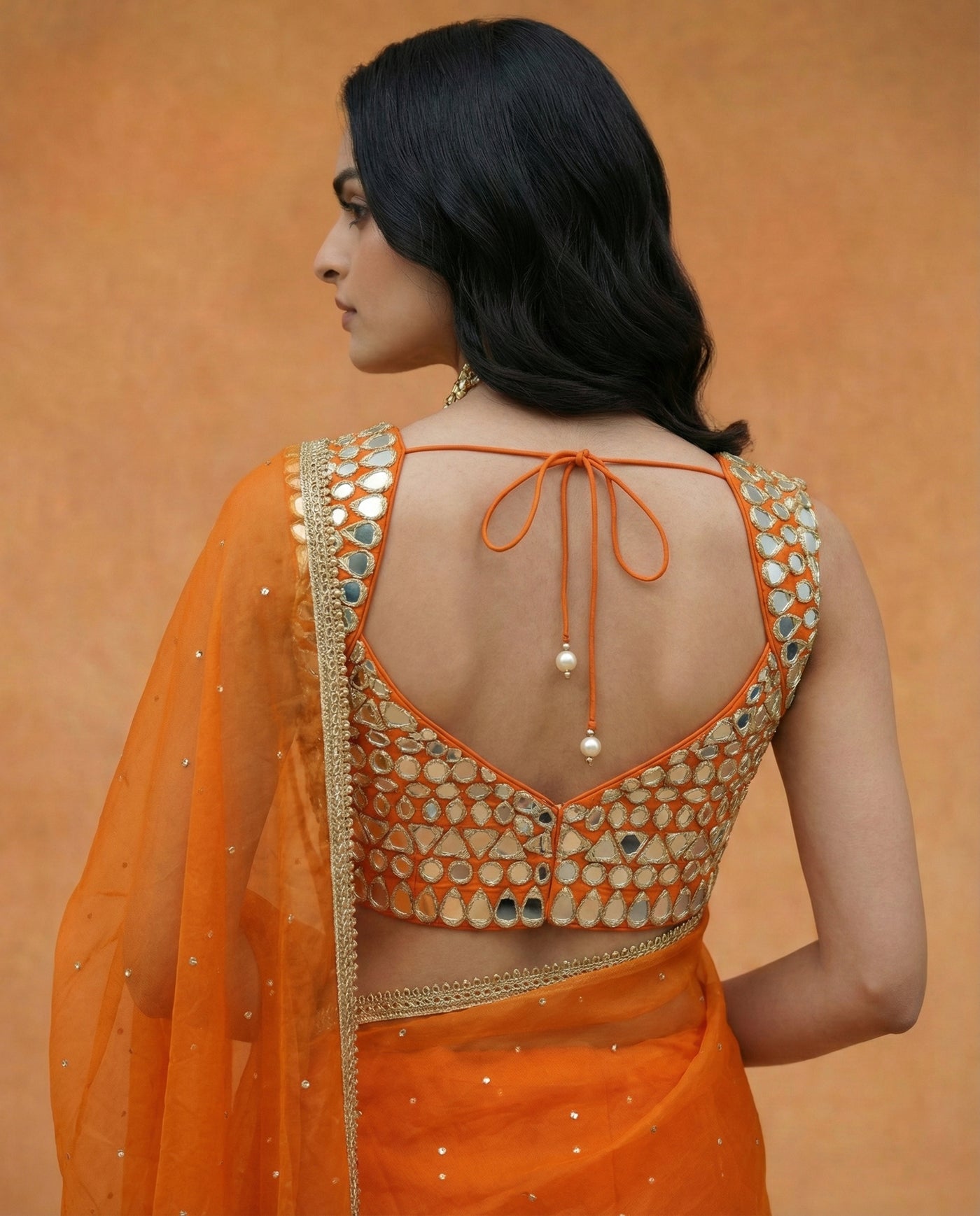 Ignite your festive wardrobe with the Kalika saree, a vibrant celebration of color and light. This ensemble features a lightweight organza saree in a brilliant sunset orange, finished with a delicate gold Gota-lace border that adds a subtle metallic shimmer to the drape. It is paired with a spectacular sleeveless blouse, meticulously hand-embellished with intricate gold mirror-work and geometric sequin patterns. Designed for high-octane celebrations, Kalika offers a perfect balance of traditional craft and contemporary shimmer, ideal for grand weddings, sangeets, or festive soirées.