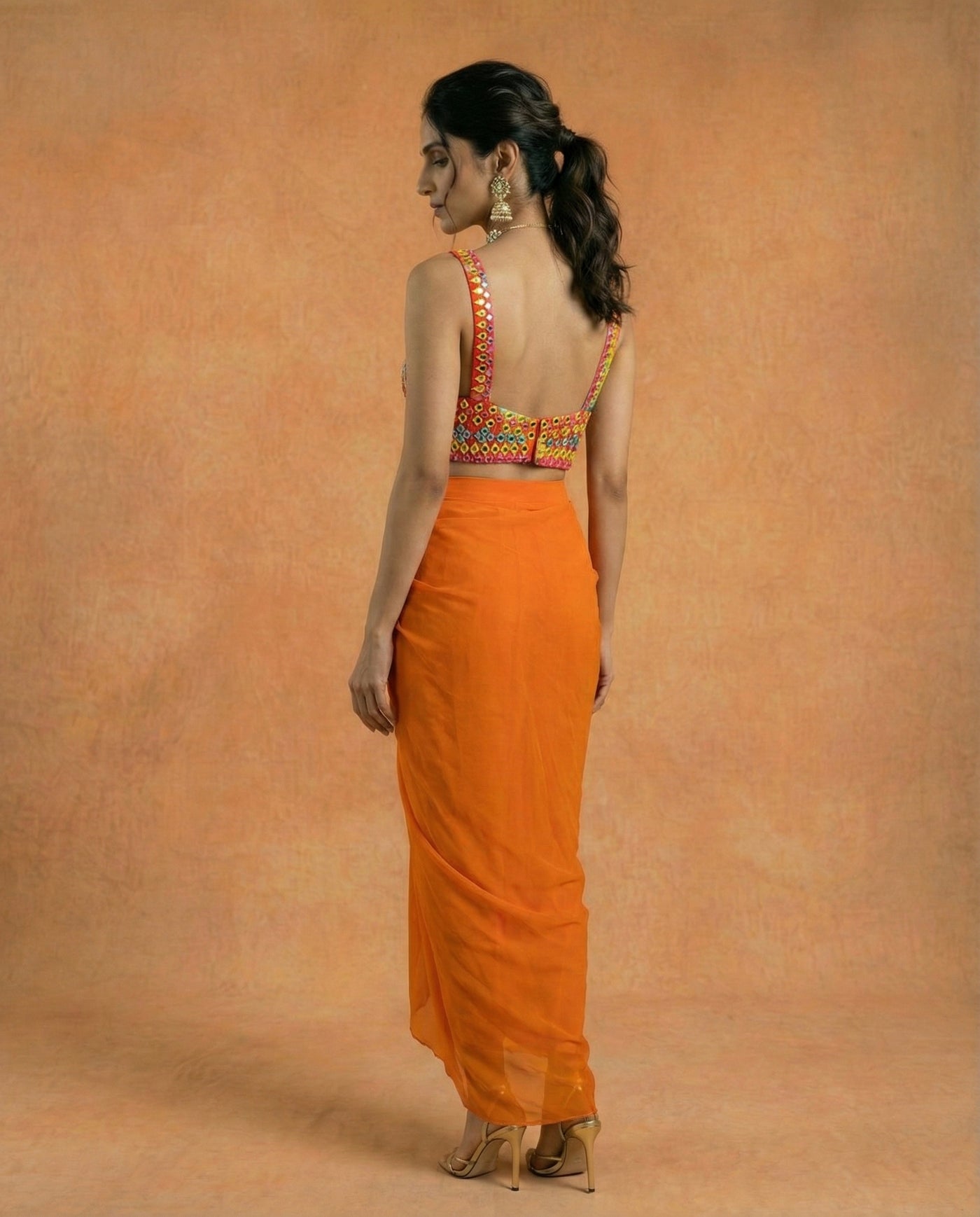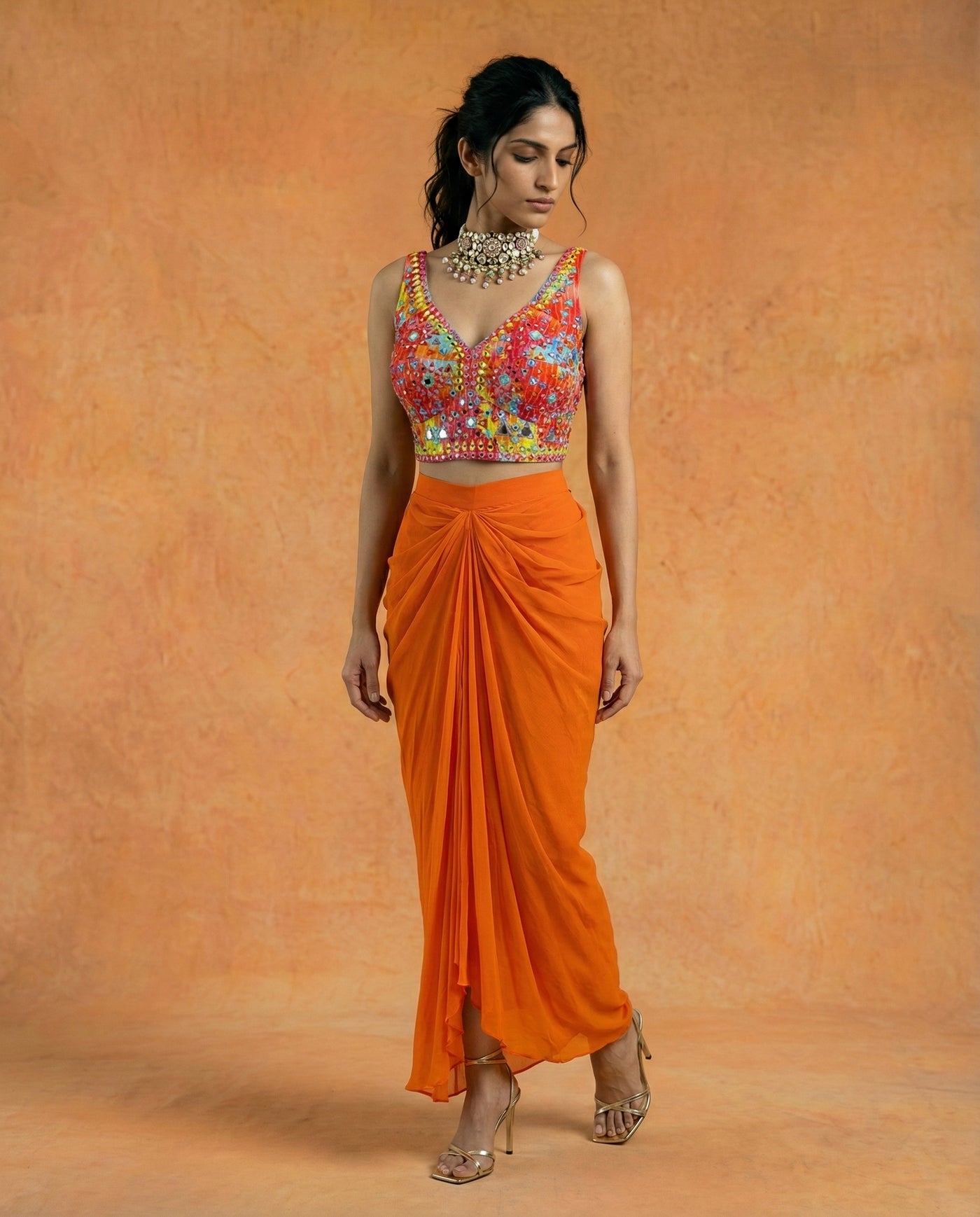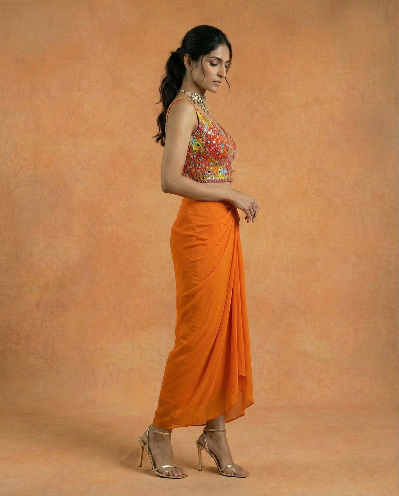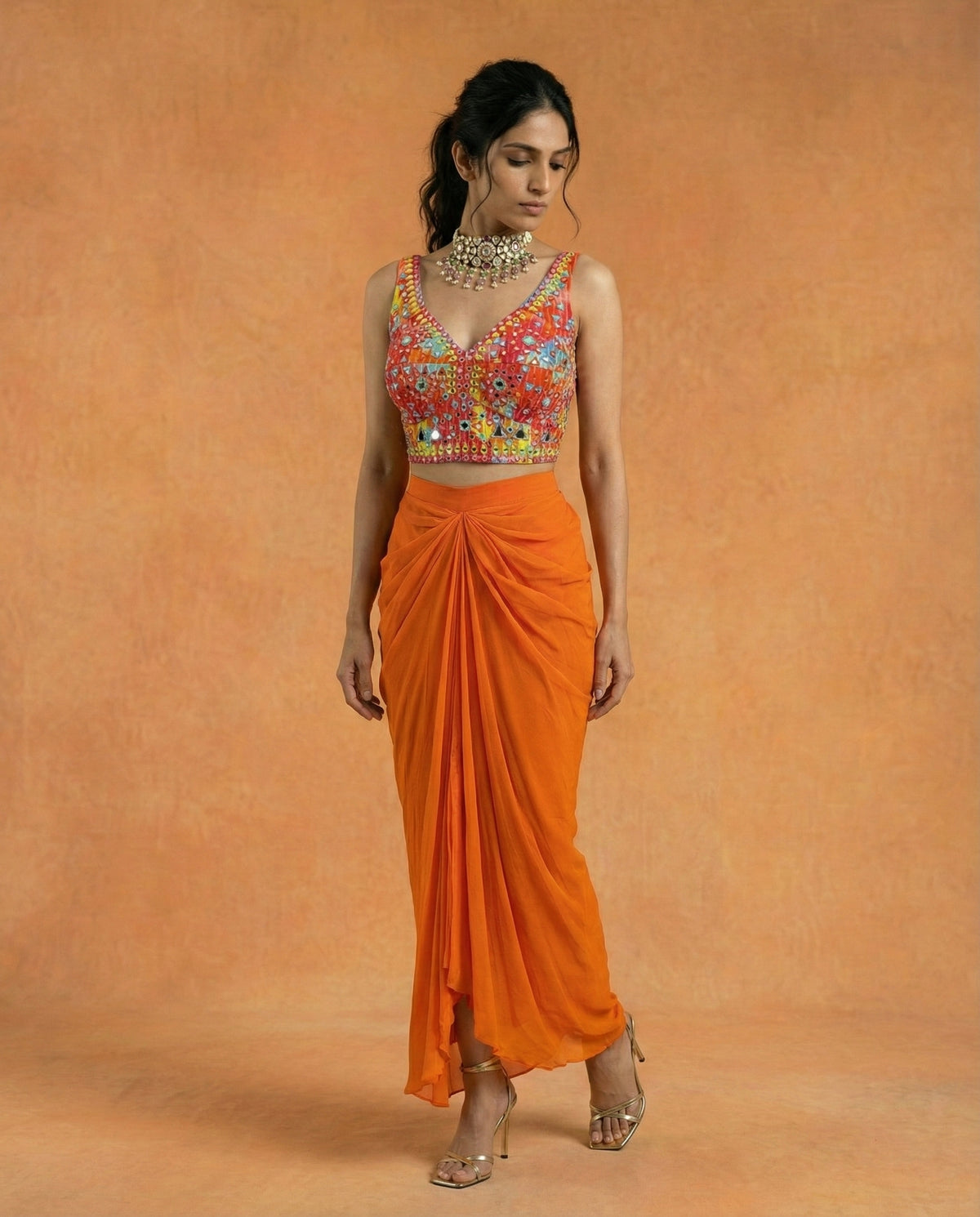 Redefine evening elegance with the Livia set, a standout ensemble from our Draped Luxe Collection. This set features a structural bustier bodice, meticulously hand-embellished with a mosaic of tonal midnight-teal sequins, metallic threadwork, and delicate floral accents along the straps. It is paired with a high-waisted, fluidly draped skirt that creates a flawless, liquid-like silhouette. The deep jewel tone combined with the sophisticated wrap-style drape makes Livia the definitive choice for cocktail parties, grand receptions, or contemporary wedding festivities.