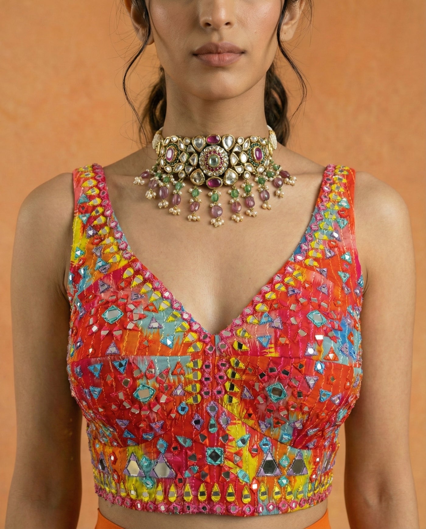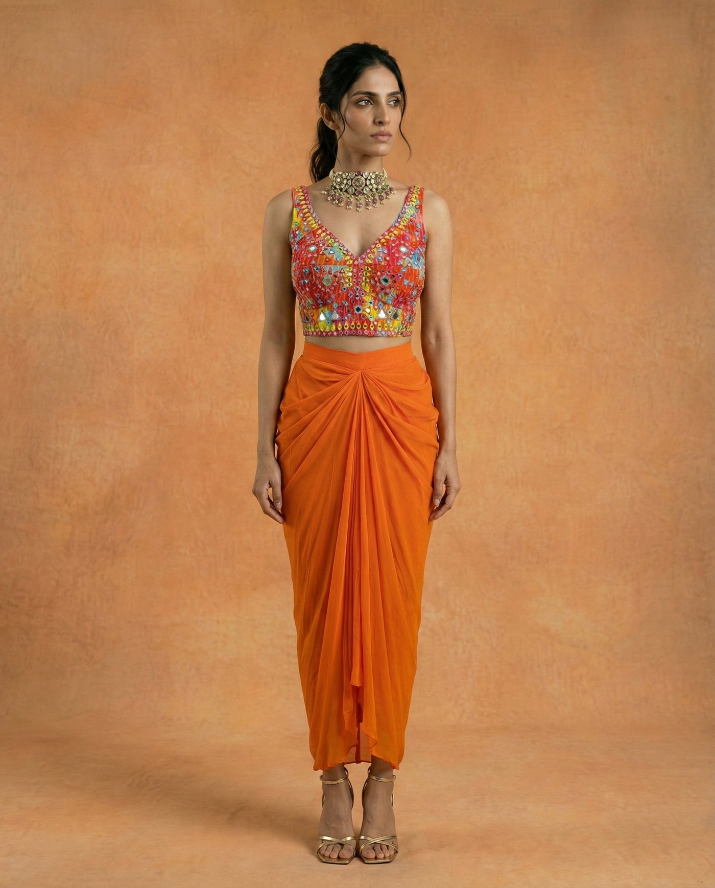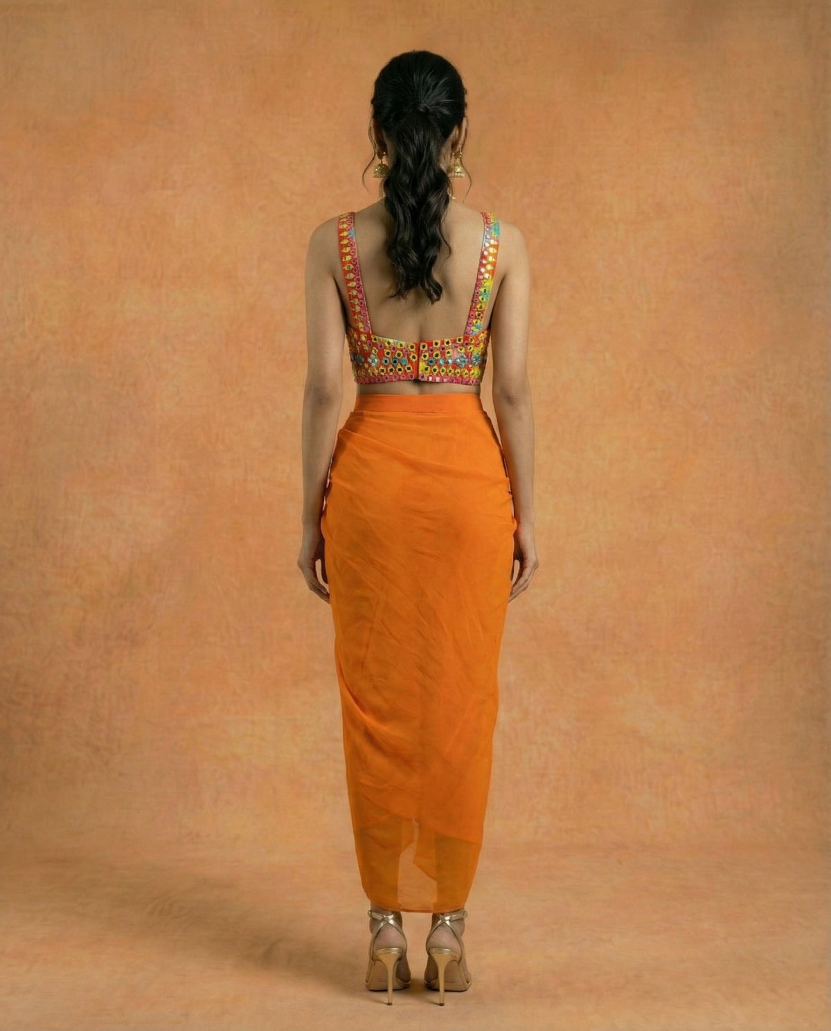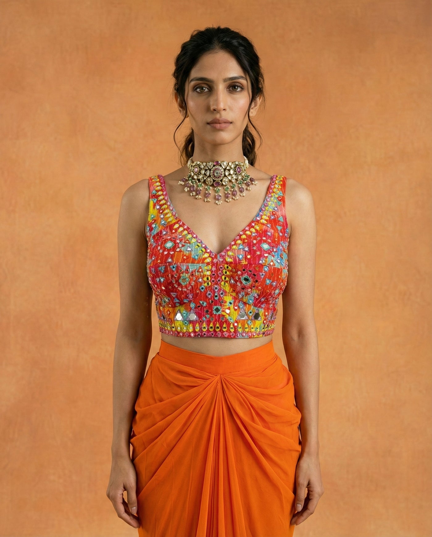 Redefine evening elegance with the Livia set, a standout ensemble from our Draped Luxe Collection. This set features a structural bustier bodice, meticulously hand-embellished with a mosaic of tonal midnight-teal sequins, metallic threadwork, and delicate floral accents along the straps. It is paired with a high-waisted, fluidly draped skirt that creates a flawless, liquid-like silhouette. The deep jewel tone combined with the sophisticated wrap-style drape makes Livia the definitive choice for cocktail parties, grand receptions, or contemporary wedding festivities.