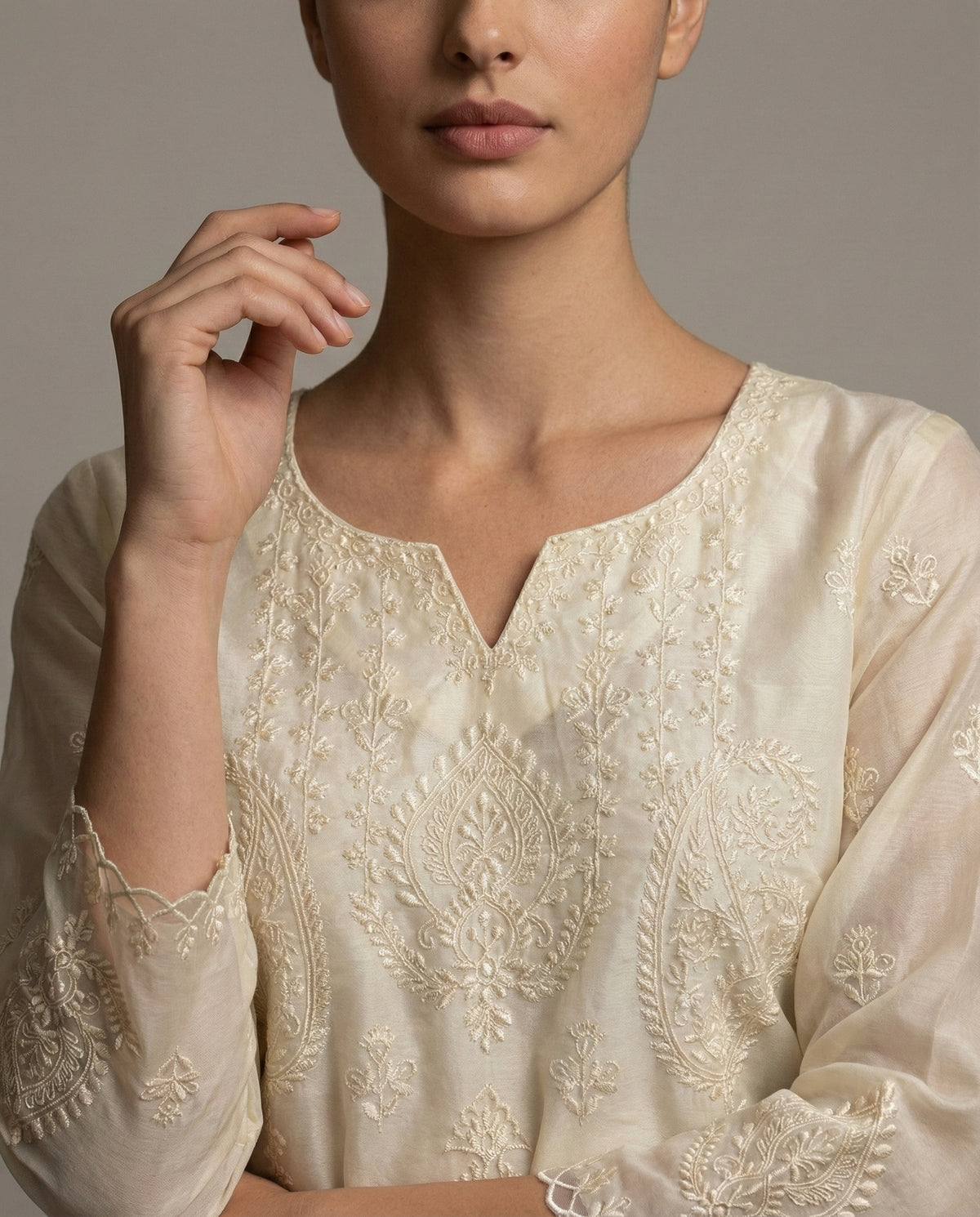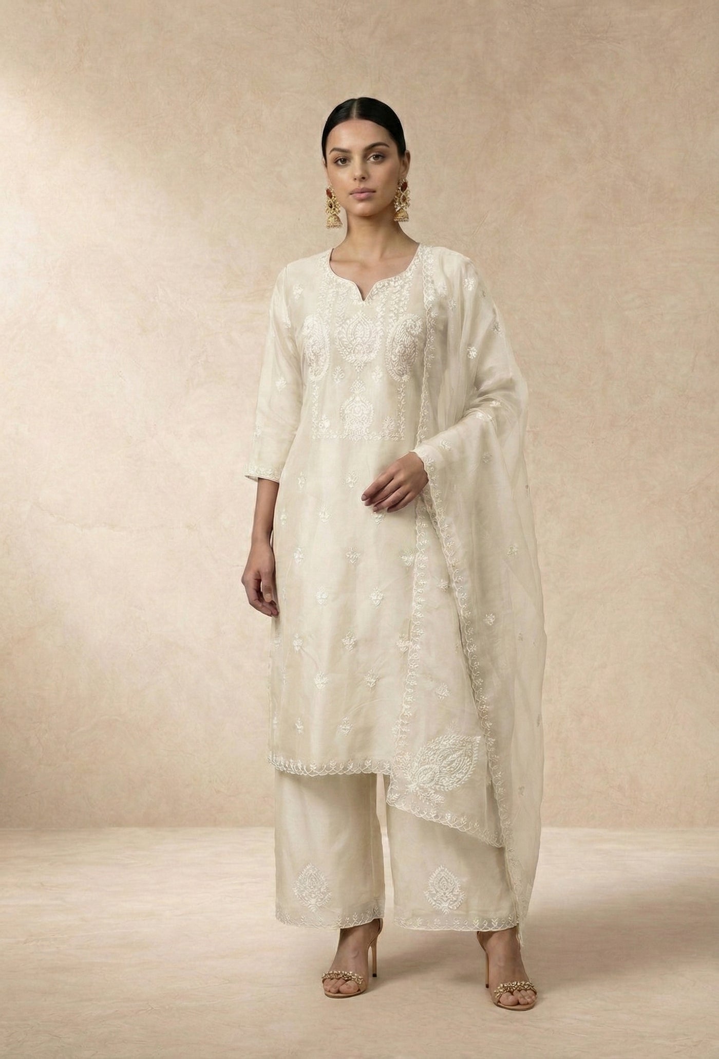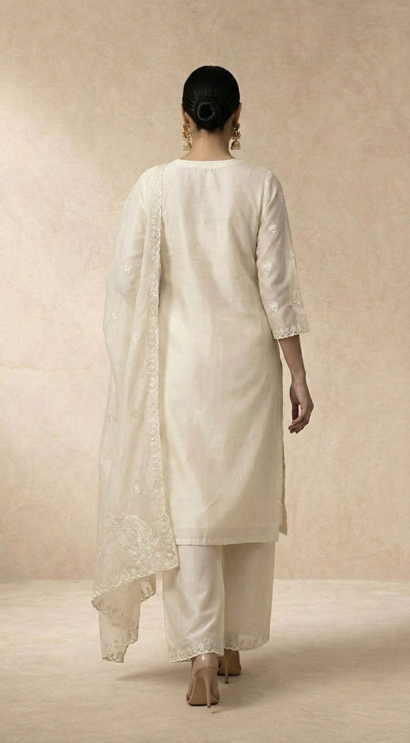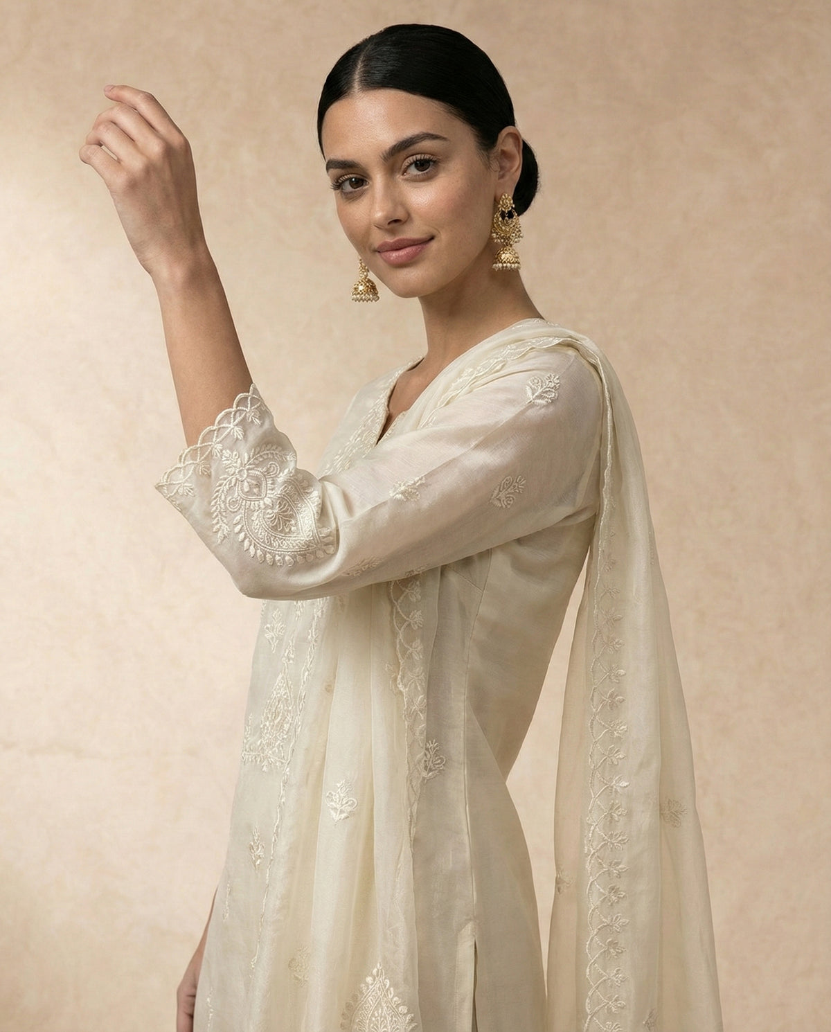 An ivory silk kurta with refined tonal embroidery, paired with fluid trousers and an organza dupatta.