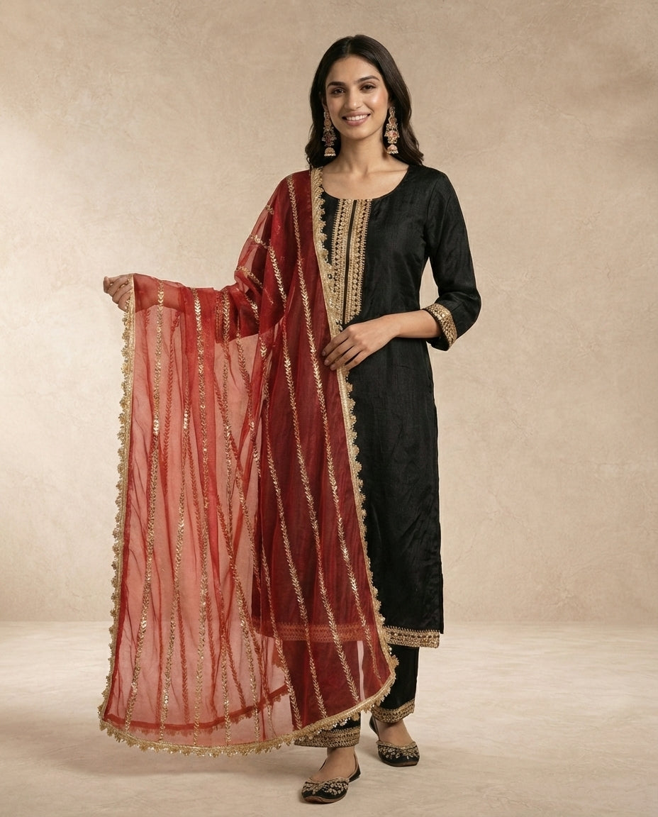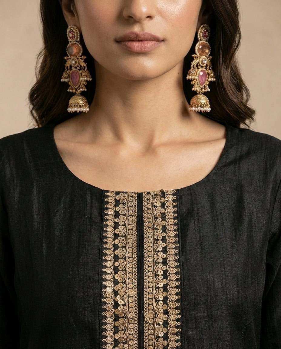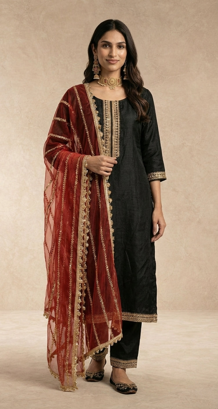 A timeless straight-cut kurta in silk, accented with gold embroidery and tailored black trouser.