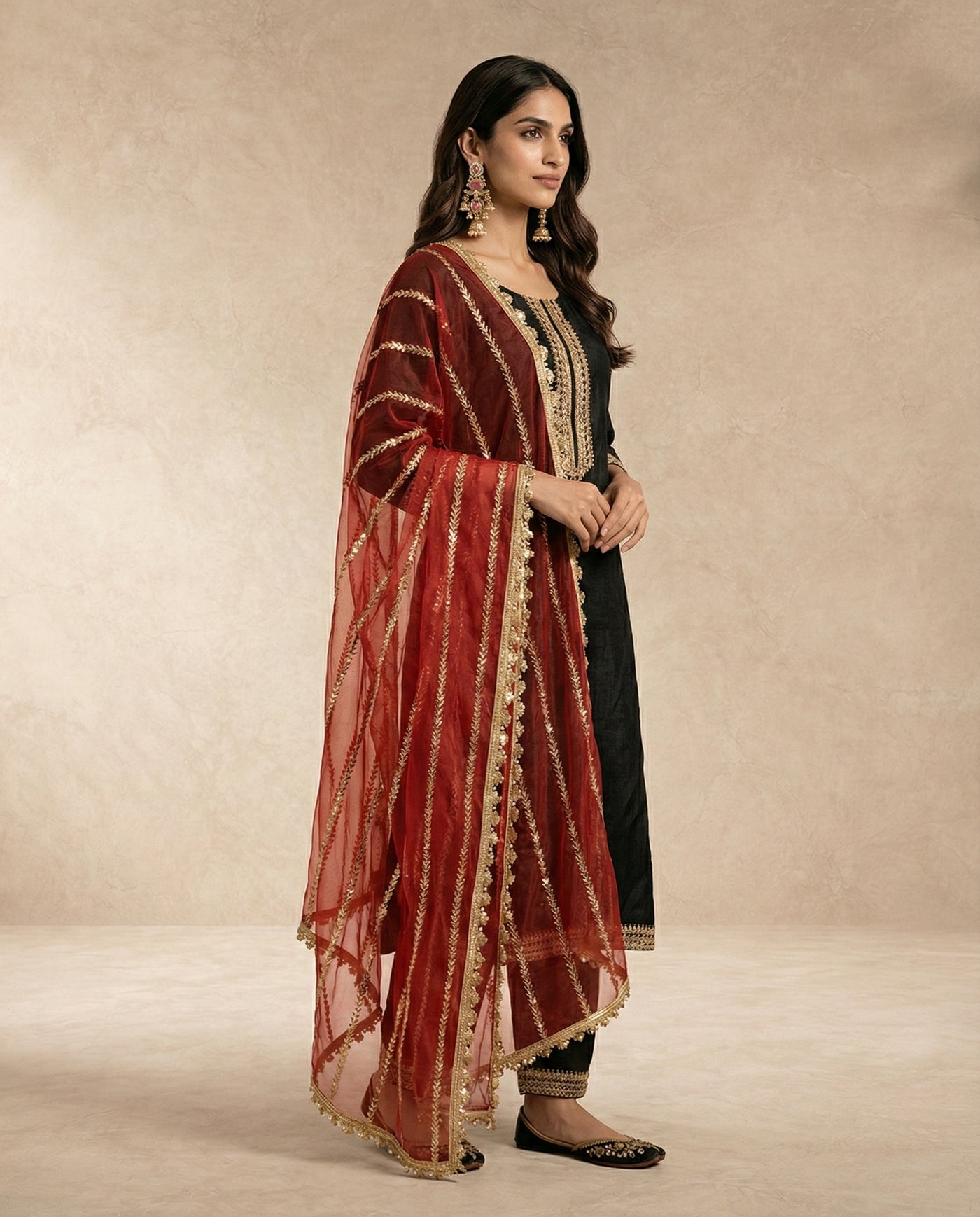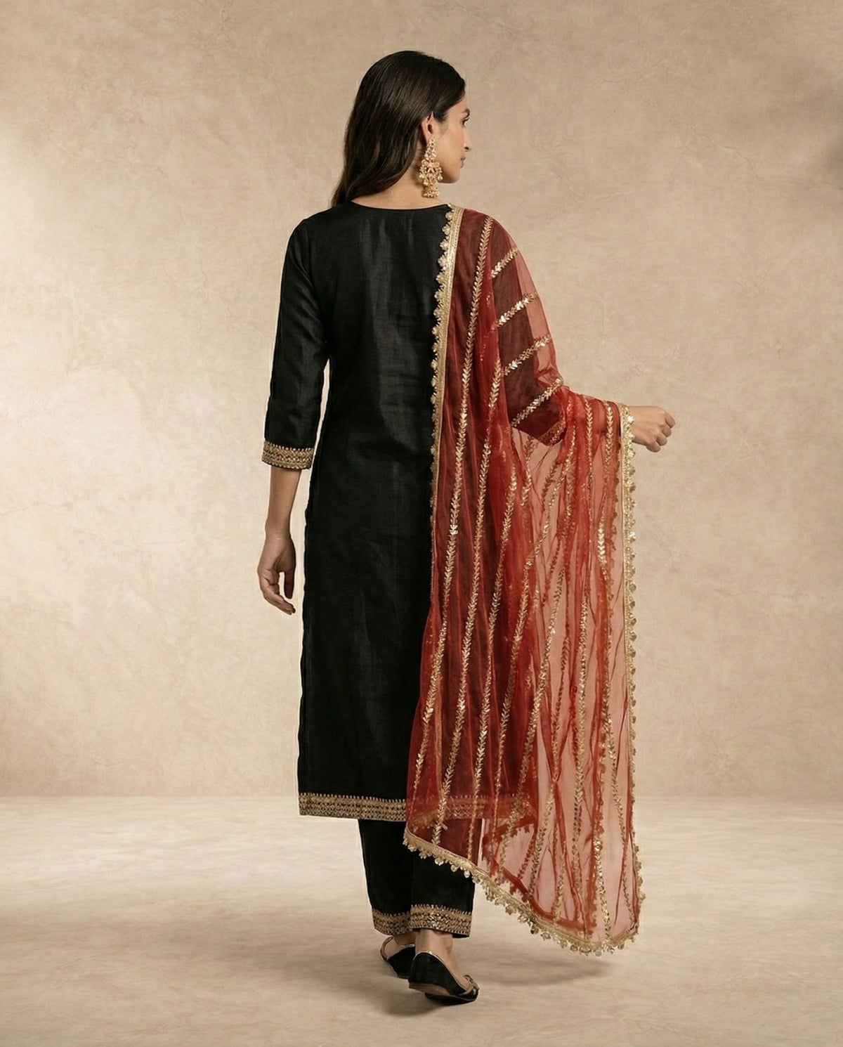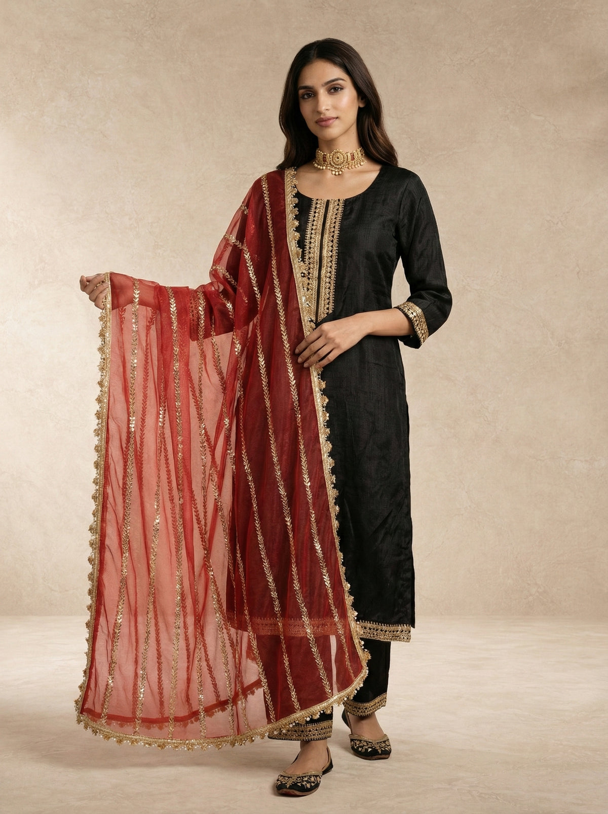 A timeless straight-cut kurta in silk, accented with gold embroidery and tailored black trouser.
