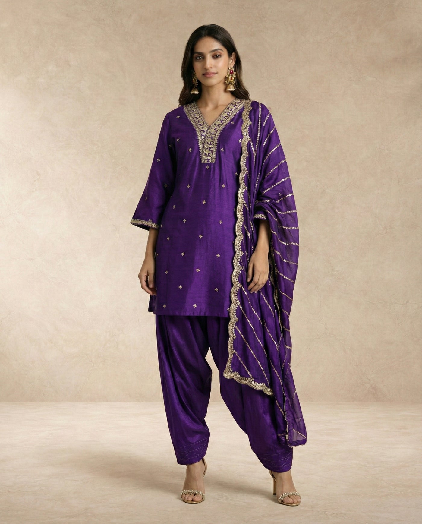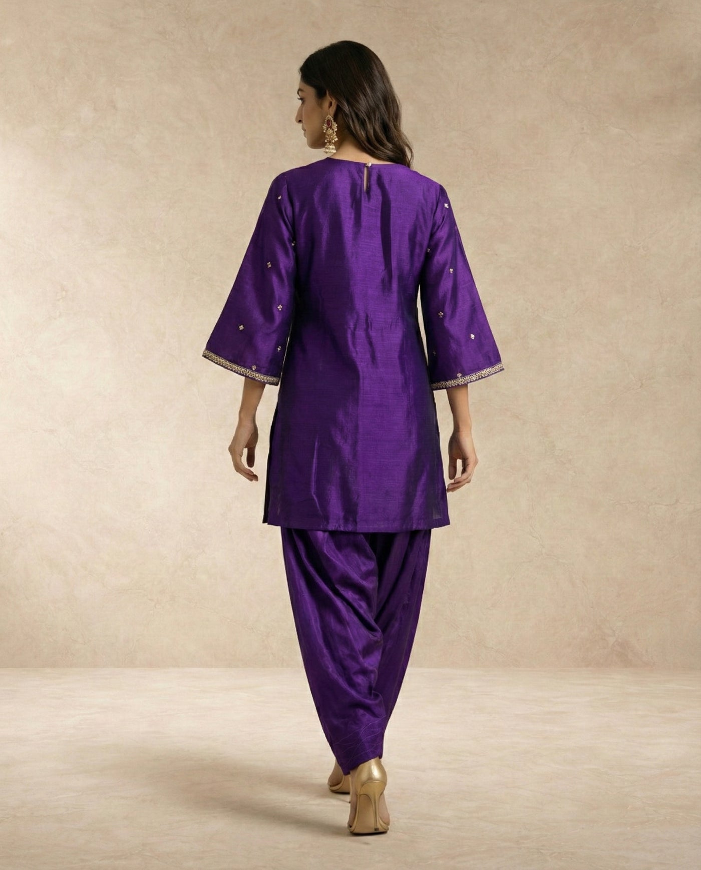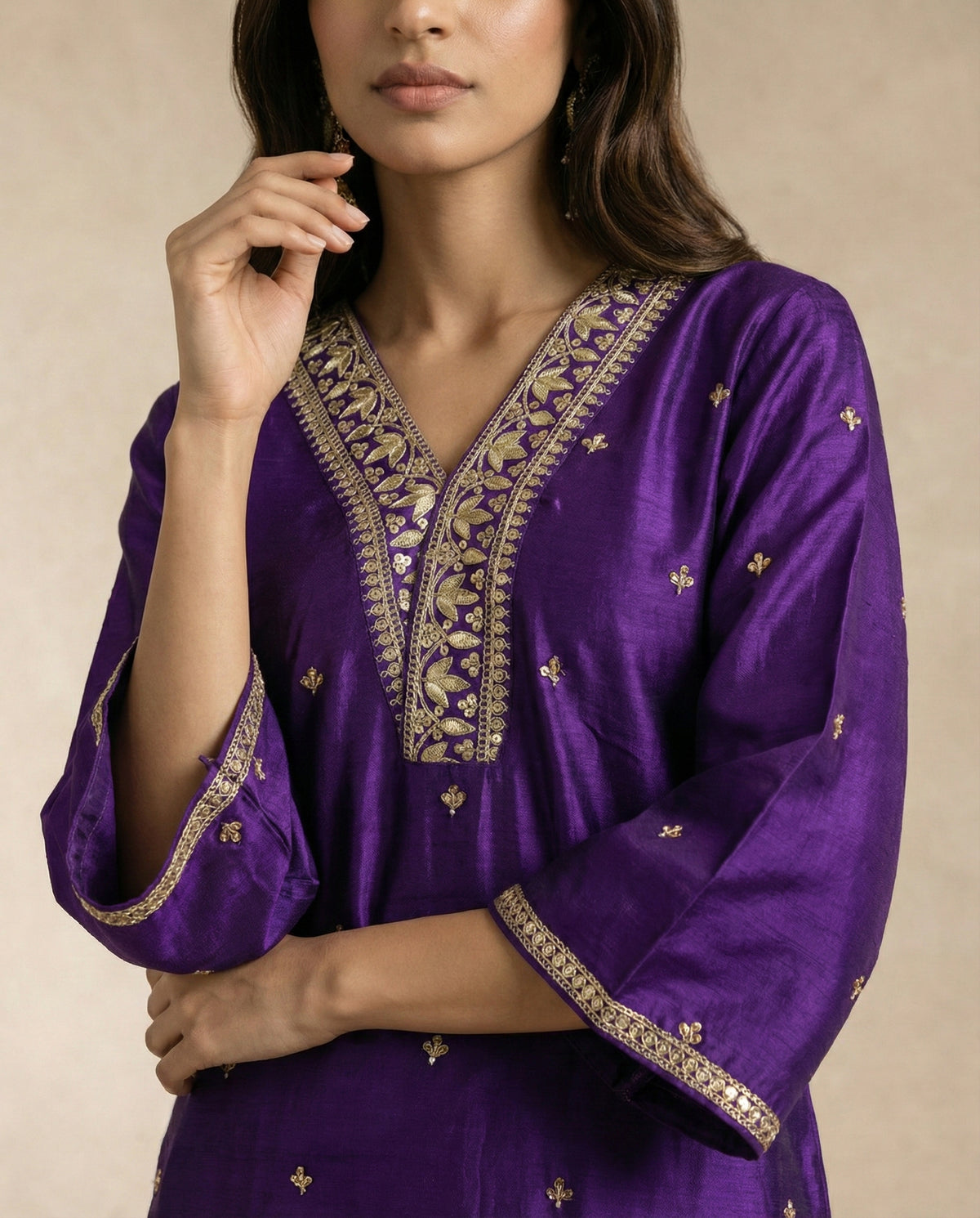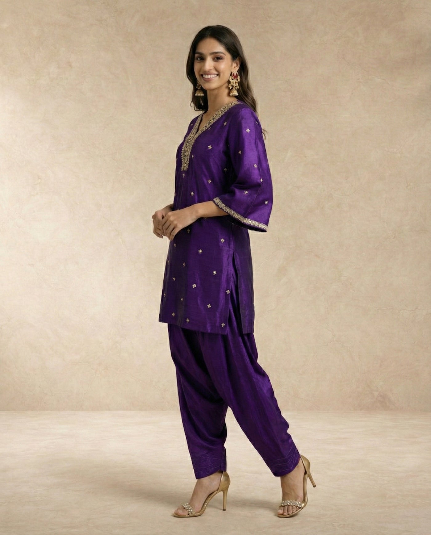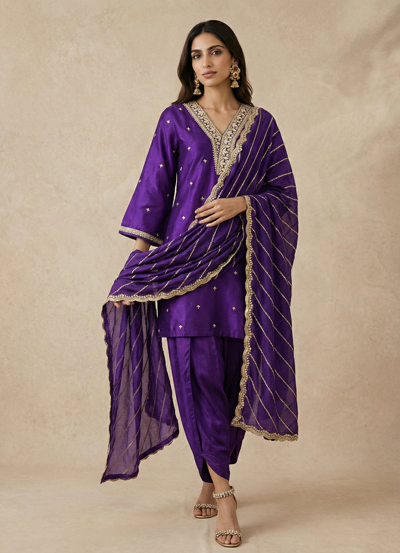 Parisa blends deep purple silk with luminous gold accents for a striking festive silhouette.