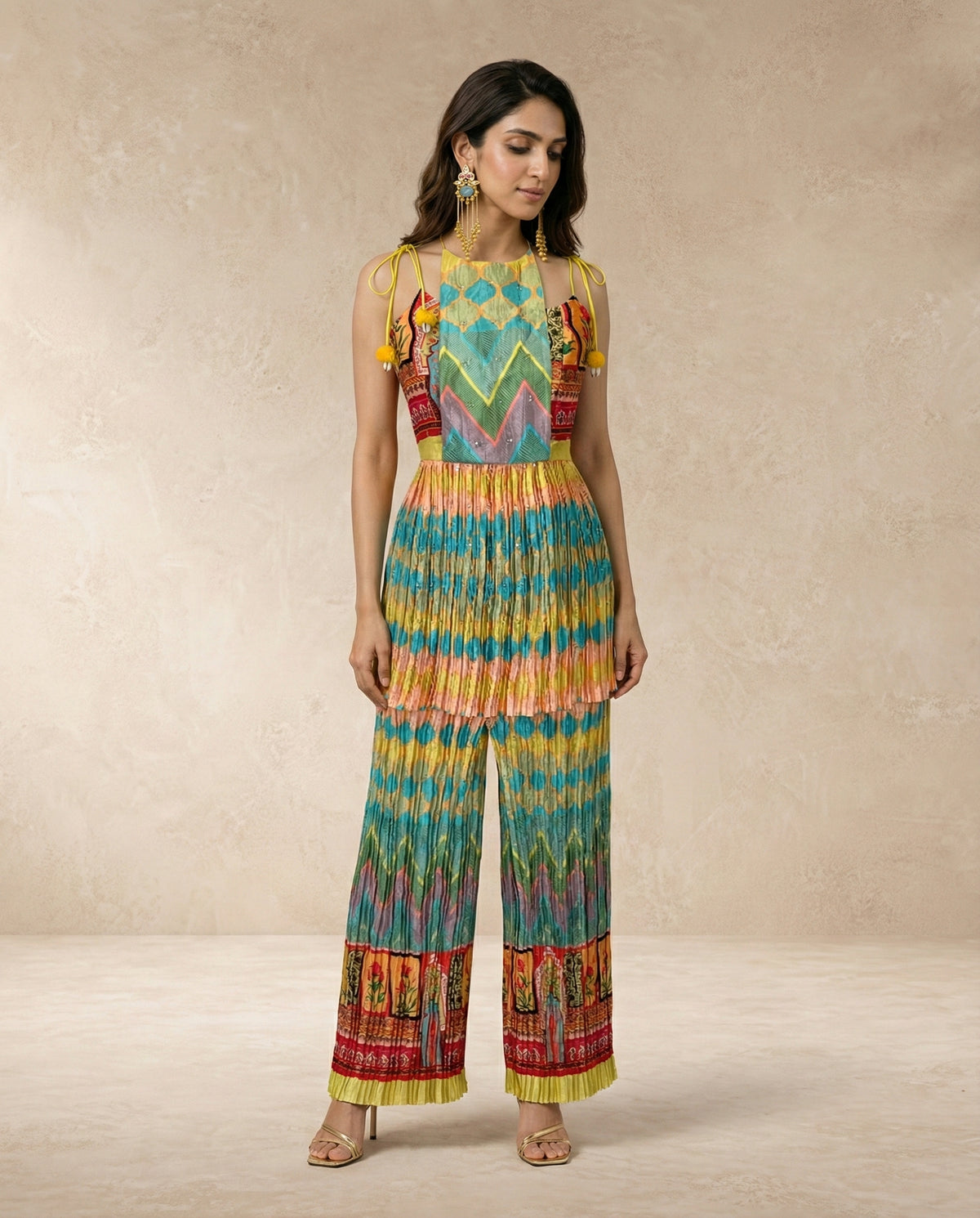 Bold, vibrant, and unapologetically artistic — SAFI is where contemporary silhouettes meet handcrafted soul. Designed in a striking palette of teal, mustard, coral, and earthy reds, this co-ord set features a beautifully structured sleeveless top paired with fluid, wide-leg pants. The intricate mix of geometric and folk-inspired prints creates a statement look that feels both modern and rooted.