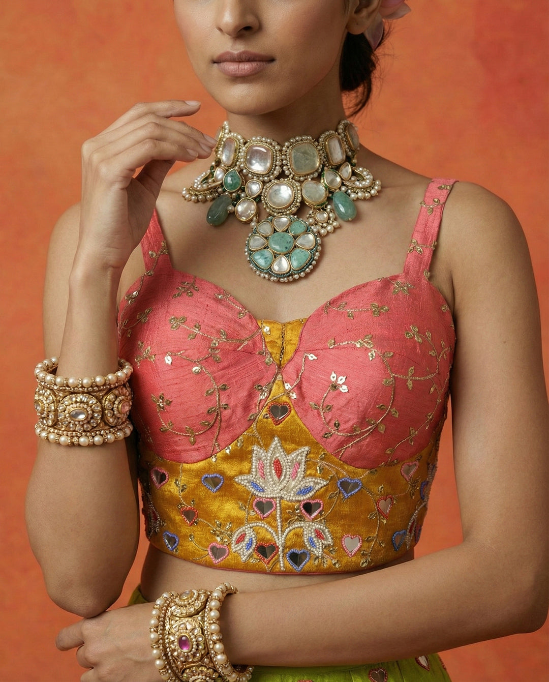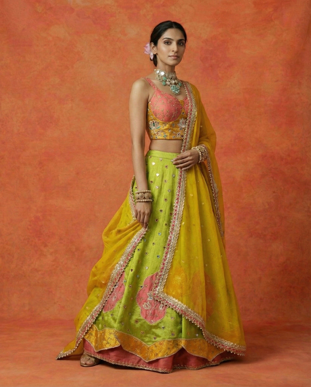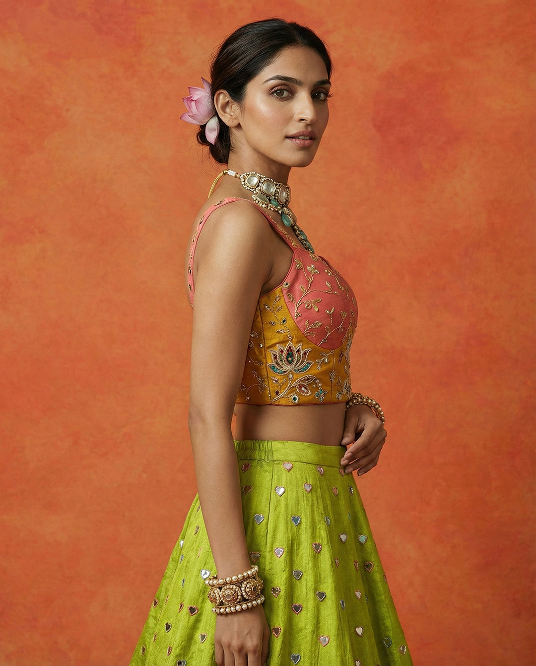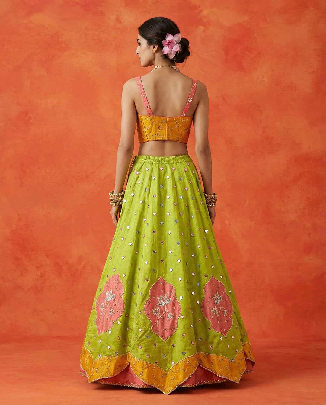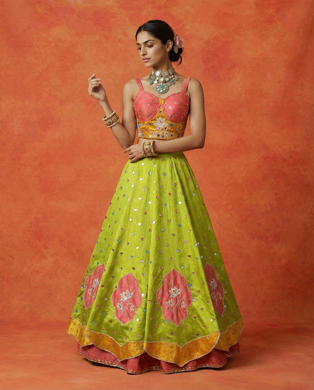 Rich raw silk lehengas featuring lotus medallion embroidery and refined mirror-work detailing.