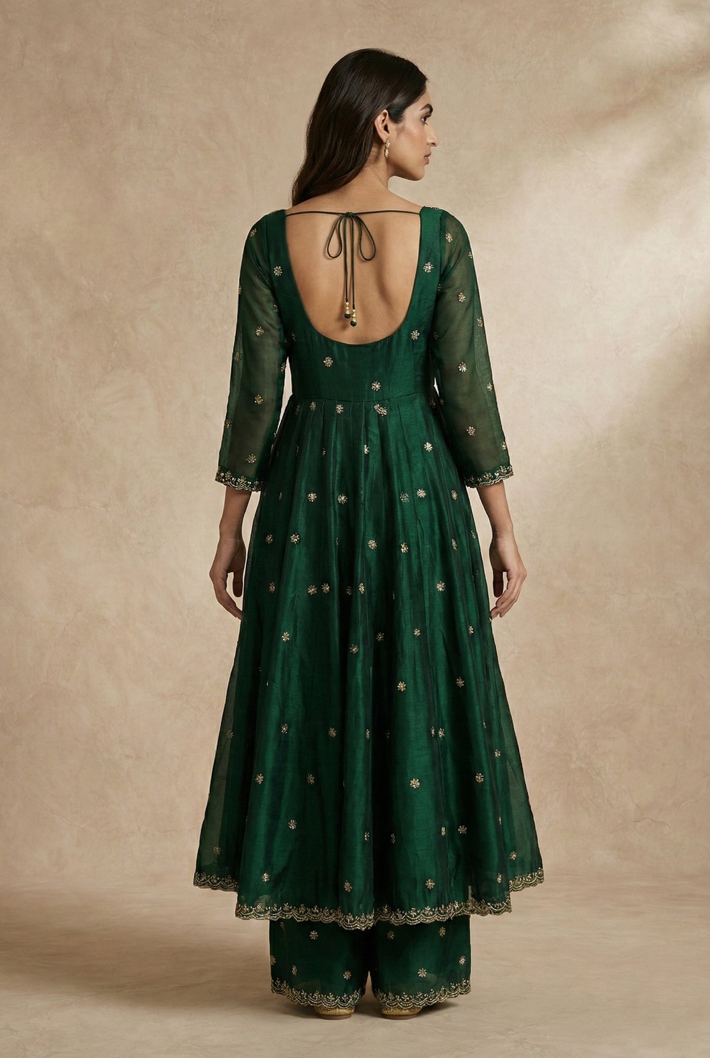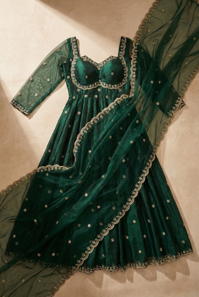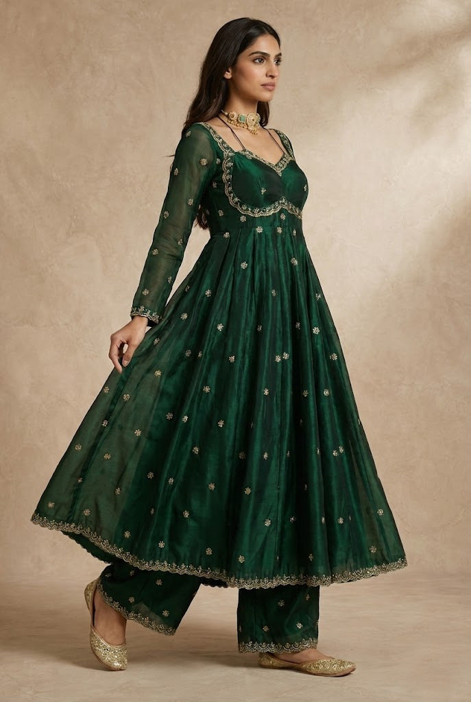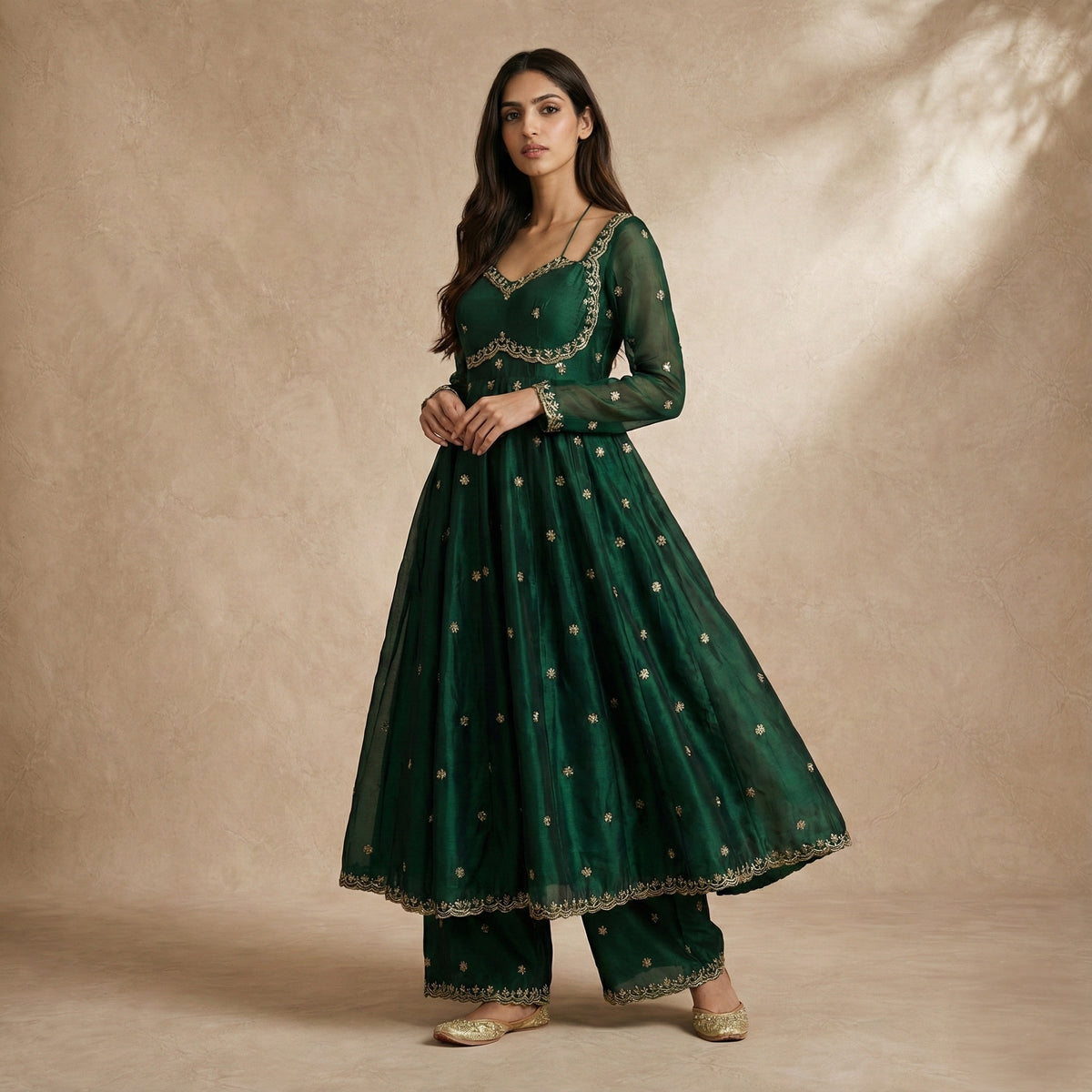 The Yasmin set is an ode to traditional opulence refined for the modern era. Cast in a deep, enchanting Emerald Forest green, this ensemble features a voluminous floor-length Anarkali crafted from high-sheen sheer silk-organza. The bodice is beautifully structured with intricate gold Resham hand-embroidery that extends into delicate floral 'booti' motifs across the flare. Paired with tonal wide-leg palazzos, this set offers a regal presence for wedding receptions, sangeets, or grand festive galas.