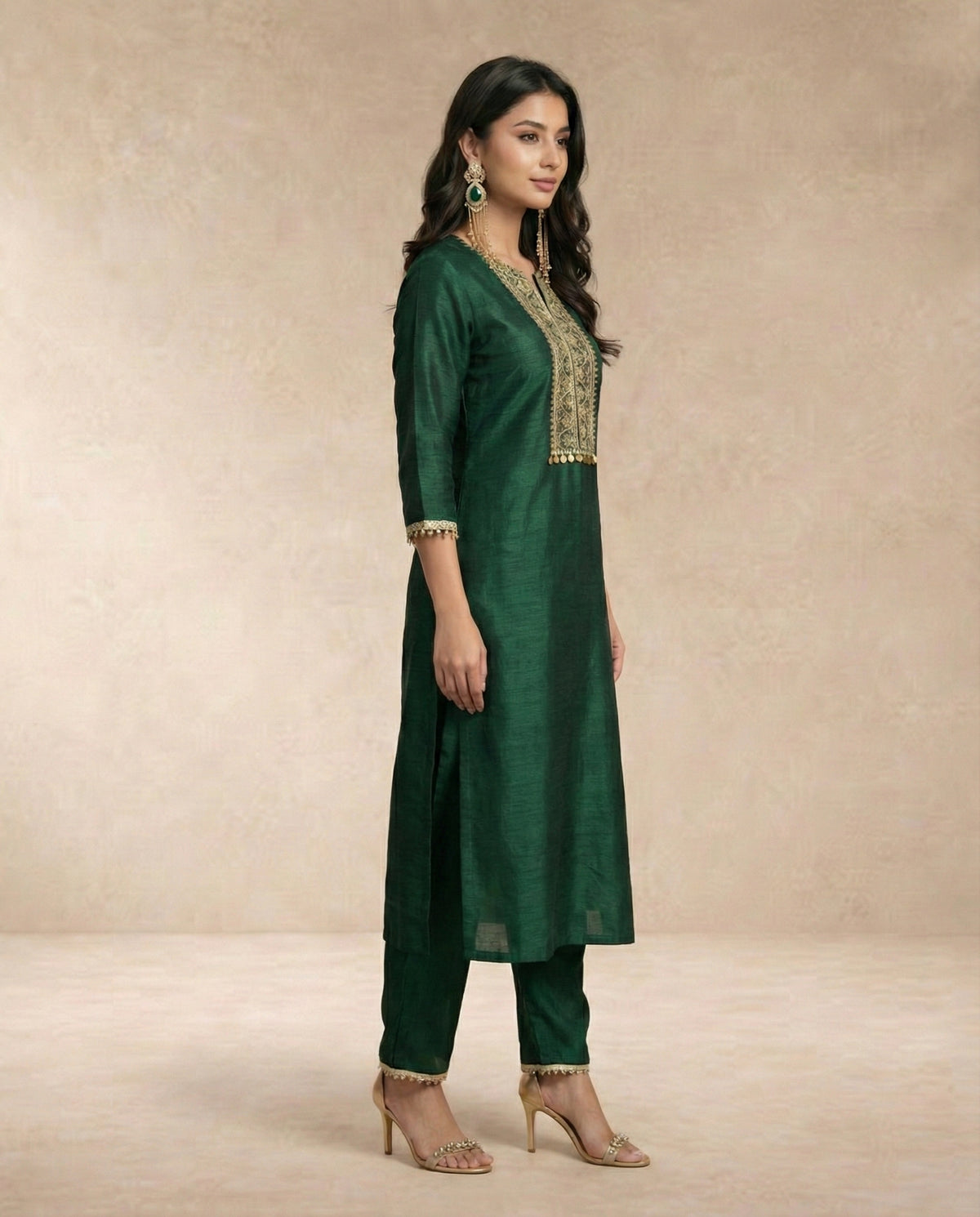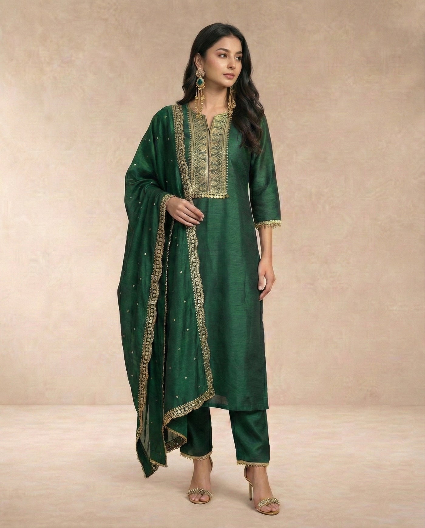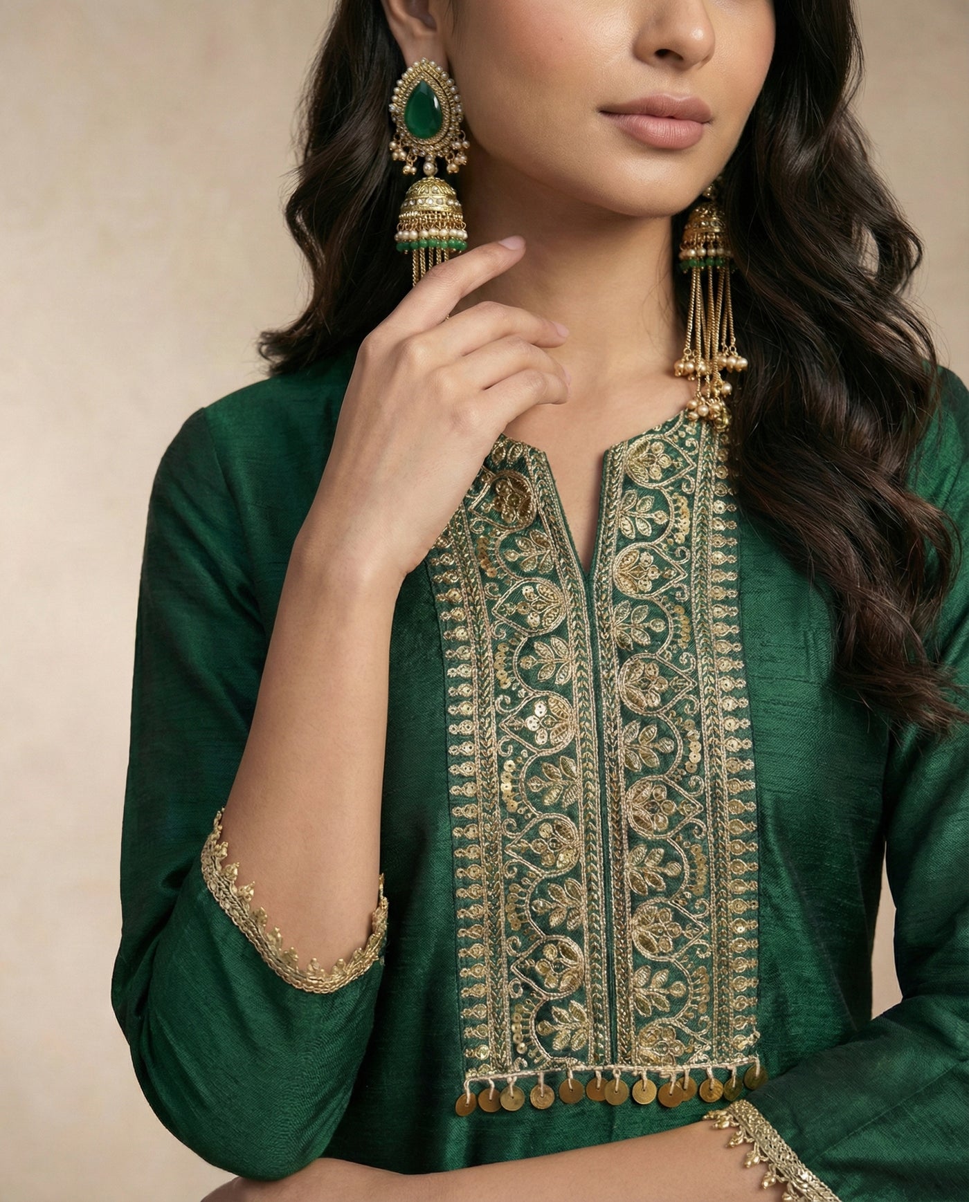 Exude timeless grace with the Zareen set, a centerpiece of our luxury ethnic collection. Rendered in a deep, majestic emerald green, this straight-cut silk kurta features an intricately mashine -embroidered yoke adorned with traditional Resham threadwork. The design is elevated by a signature coin-style metallic fringe at the hem of the bib and delicate pearl-bead detailing on the cuffs. Paired with coordinating silk tapered trousers and a matching sheer dupatta with shimmering sequin "butis" and a scalloped gold border, this ensemble is designed for grand festive occasions and wedding celebrations.