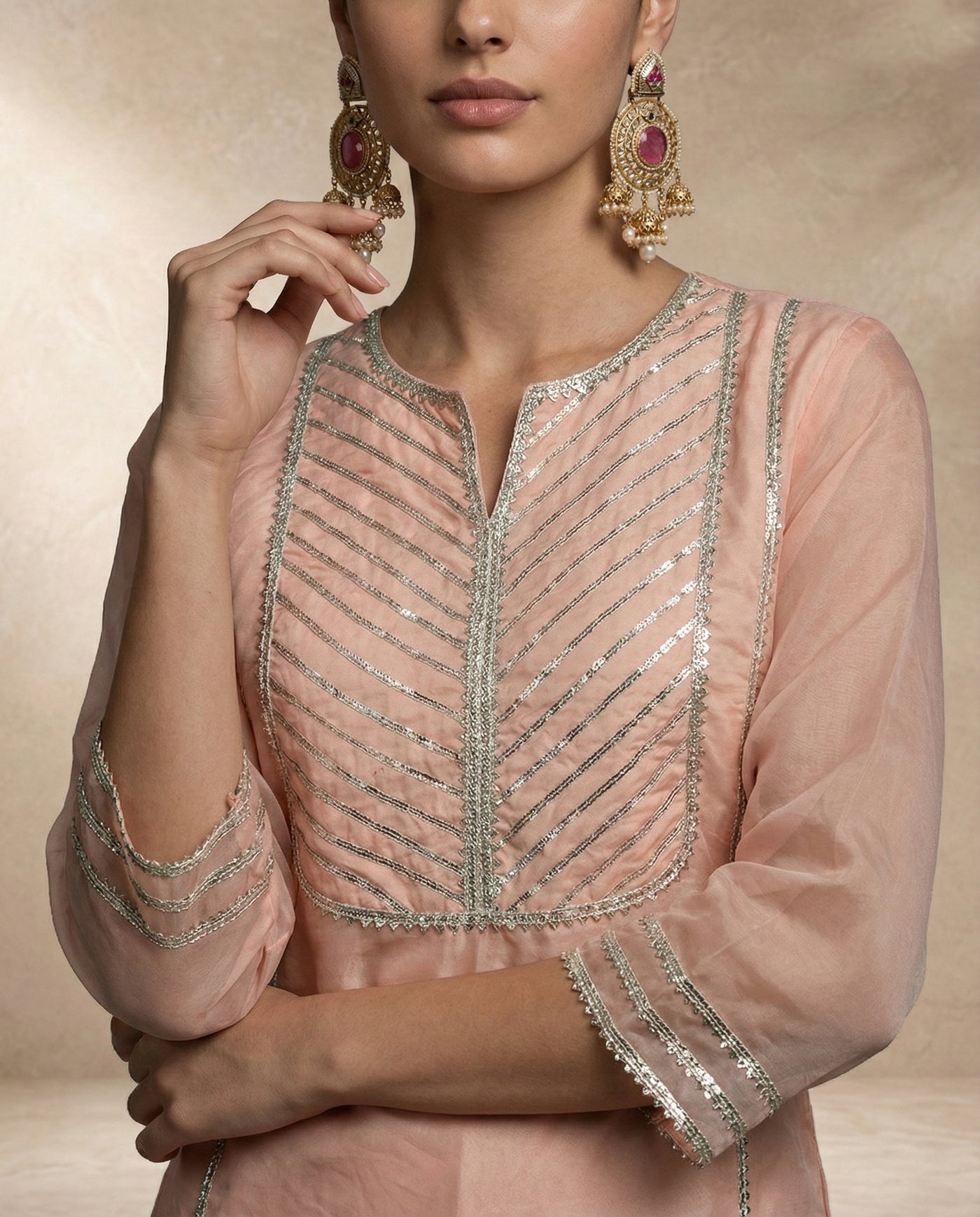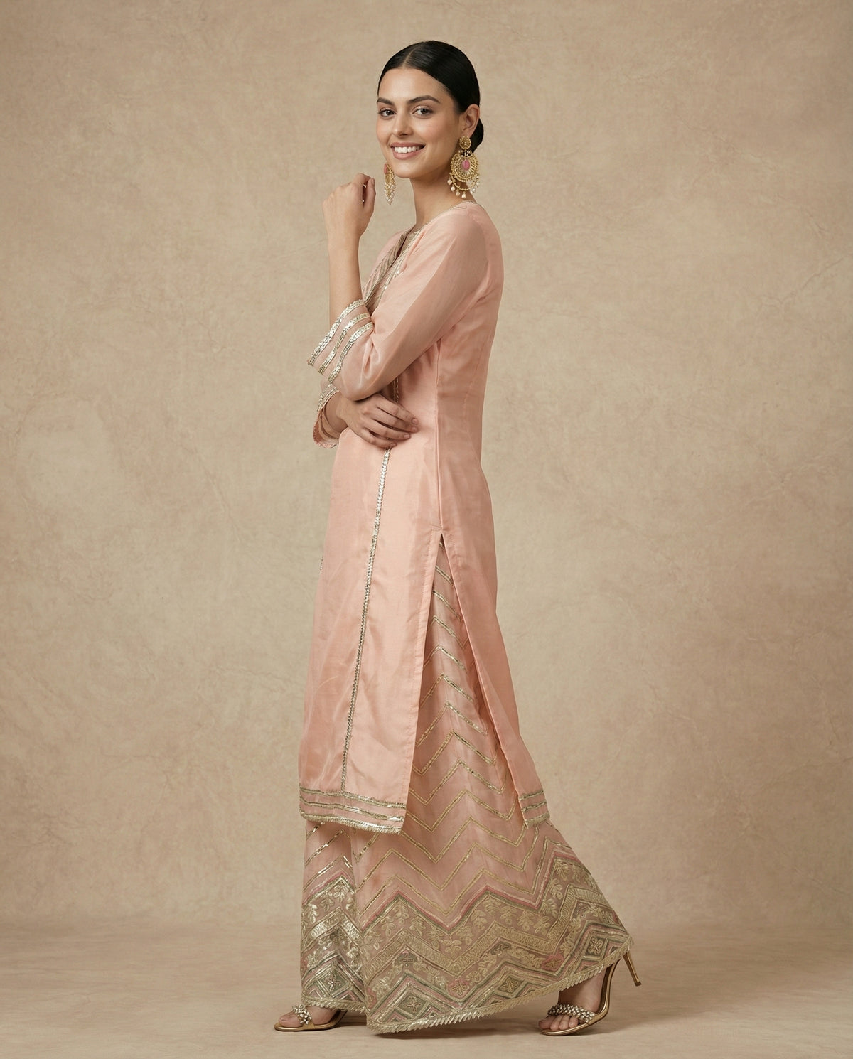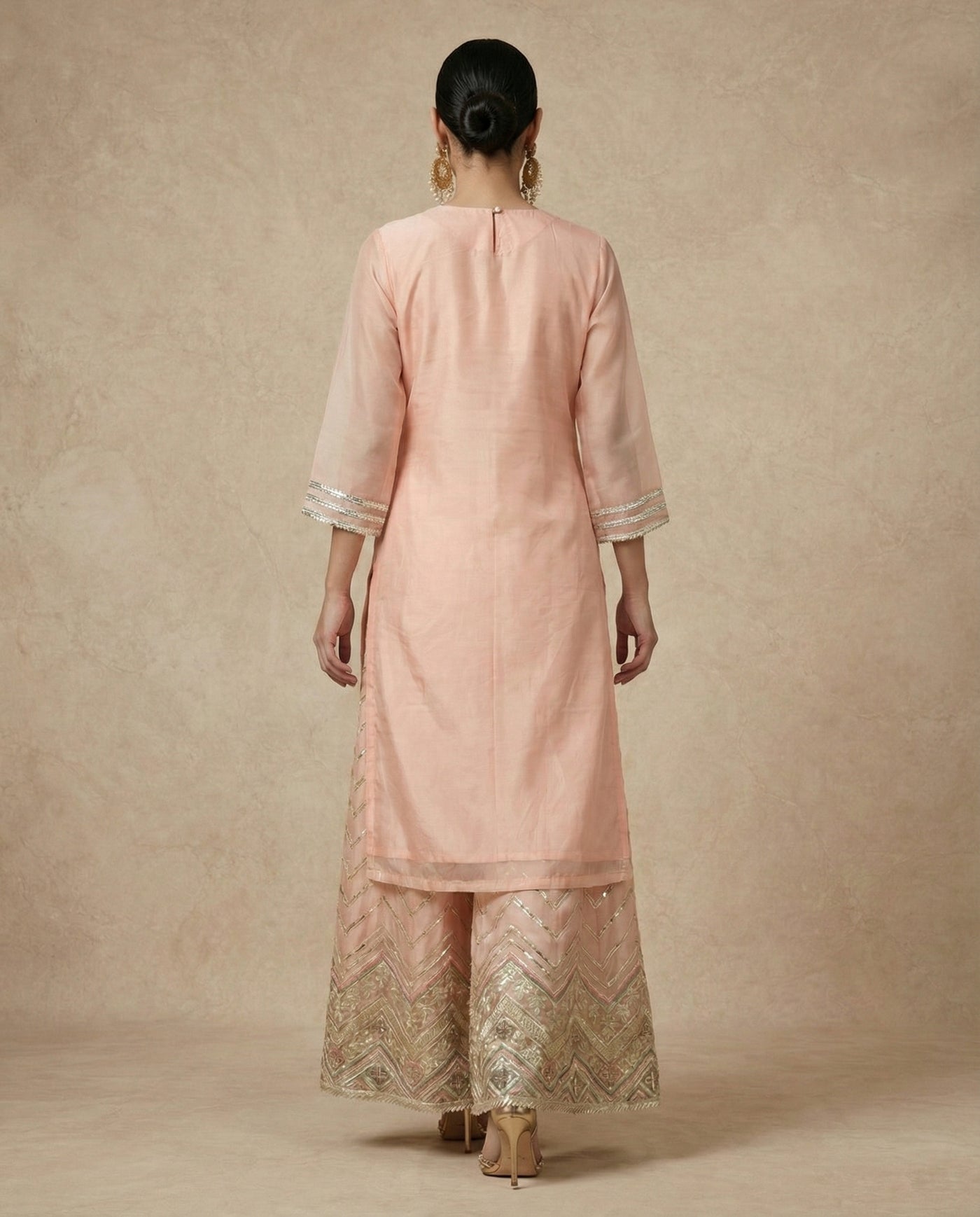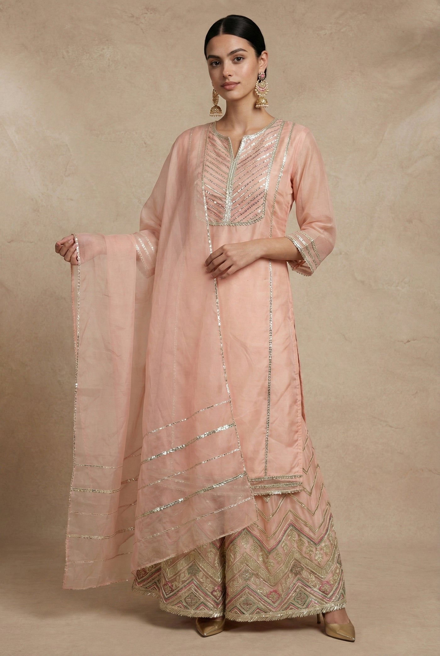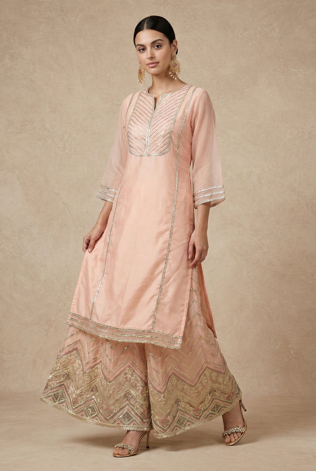 Peach silk V-neck kurta with silver zari work, paired with a flared sharara featuring floral borders.
