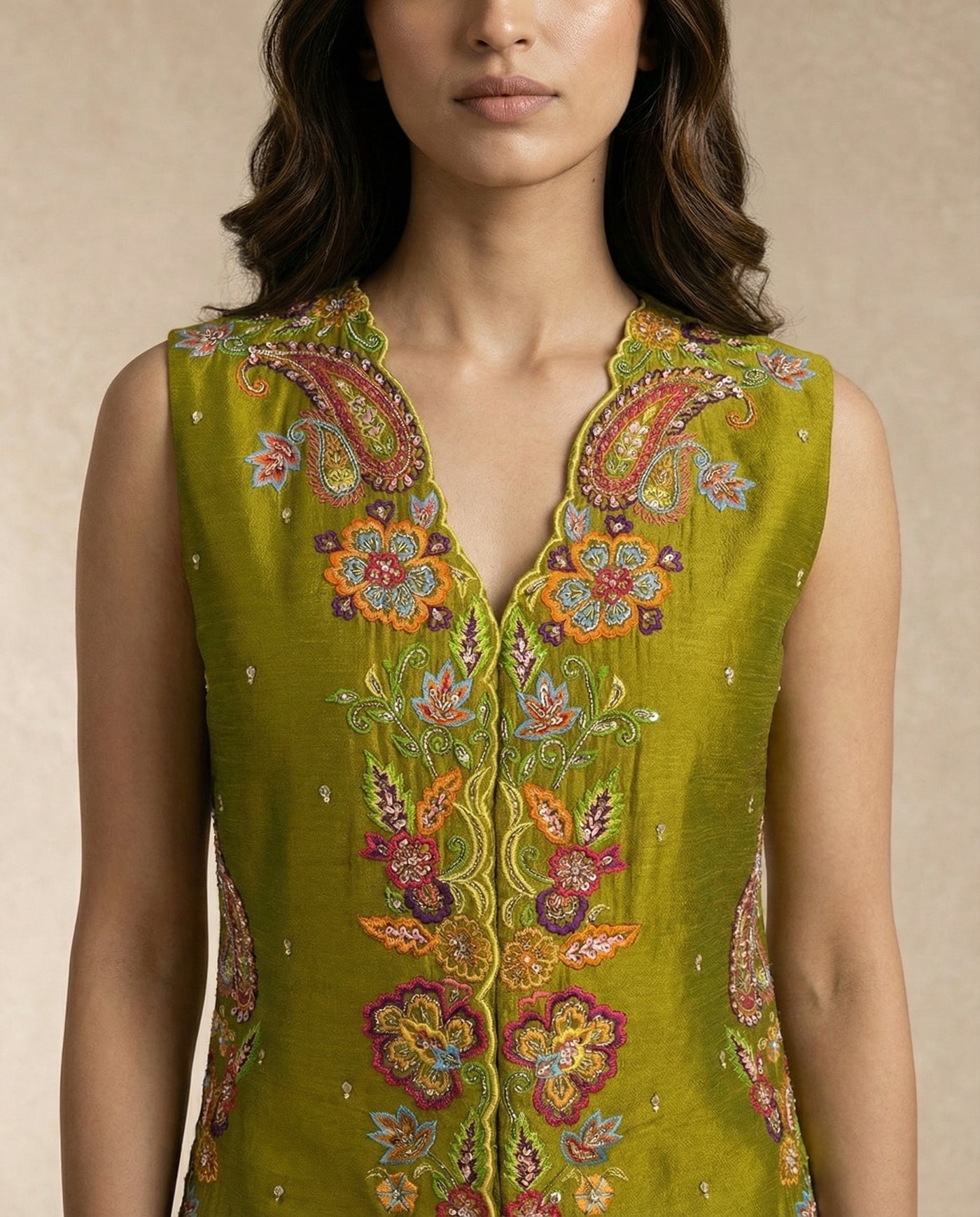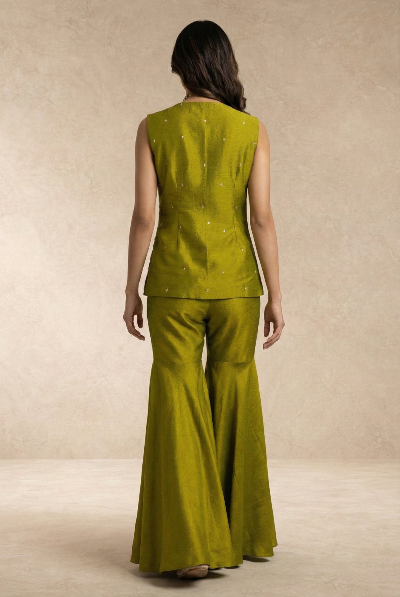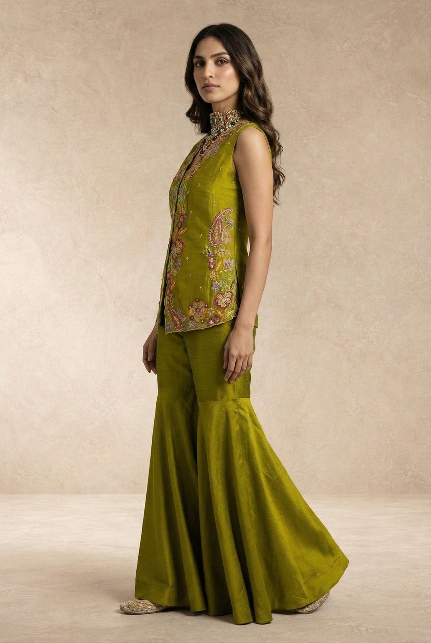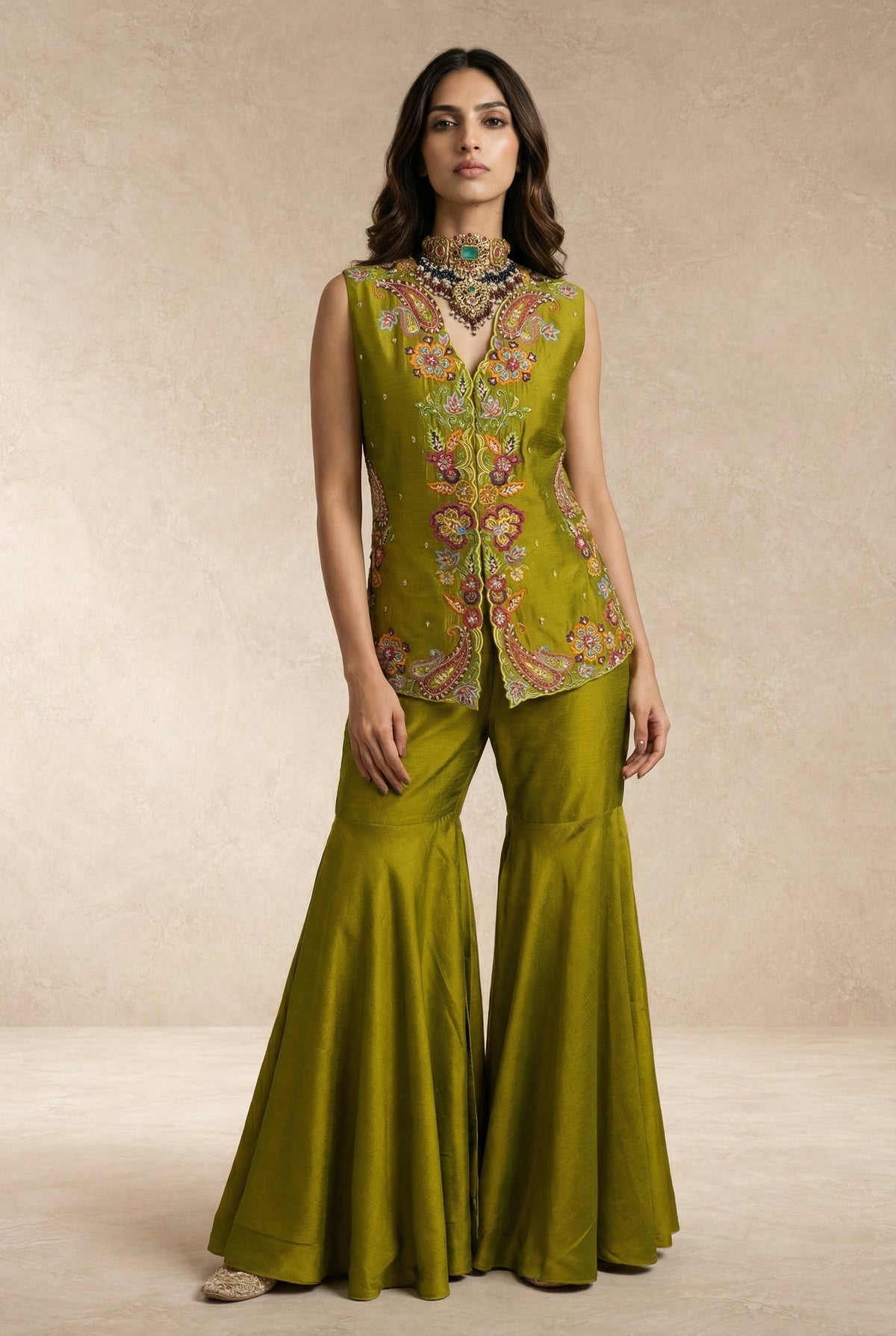 A parrot-green ensemble featuring an embroidered long-line waistcoat paired with dramatic flared shararas.